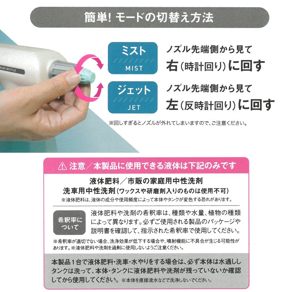 | ※ 洗車用中性洗剤は、ワックス・研磨剤入りタイプは使用不可。 ※ 液体肥料は成分や使用頻度によりタンクや本体が変色する場合があります。 ※ 本製品に防水性能はありません。丸洗いしたり水につけないでください。 | |