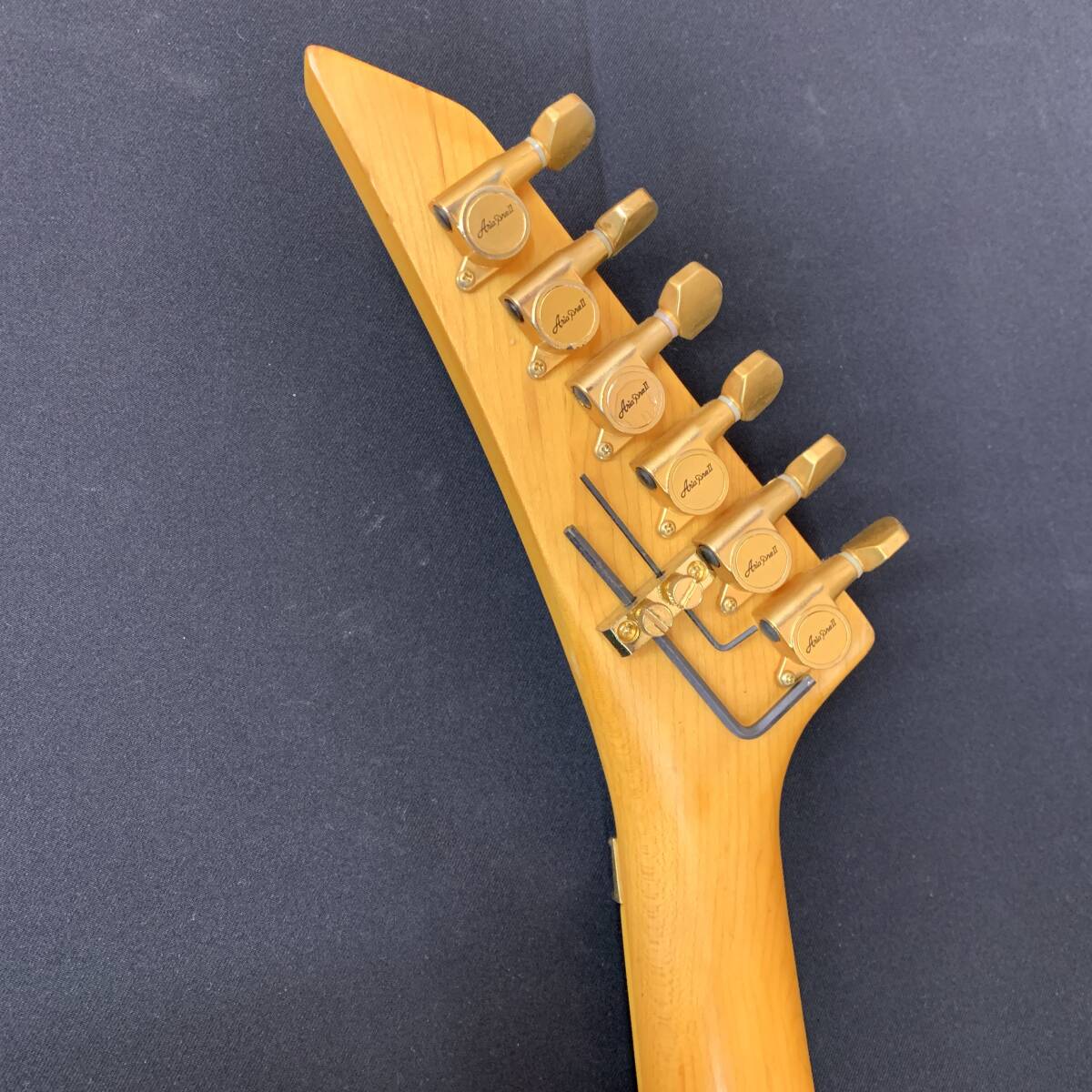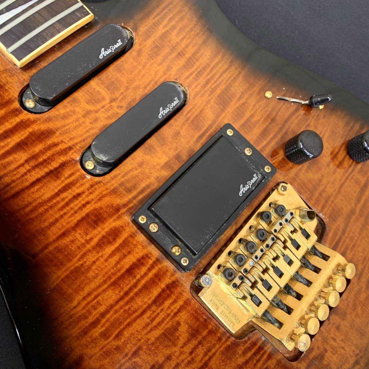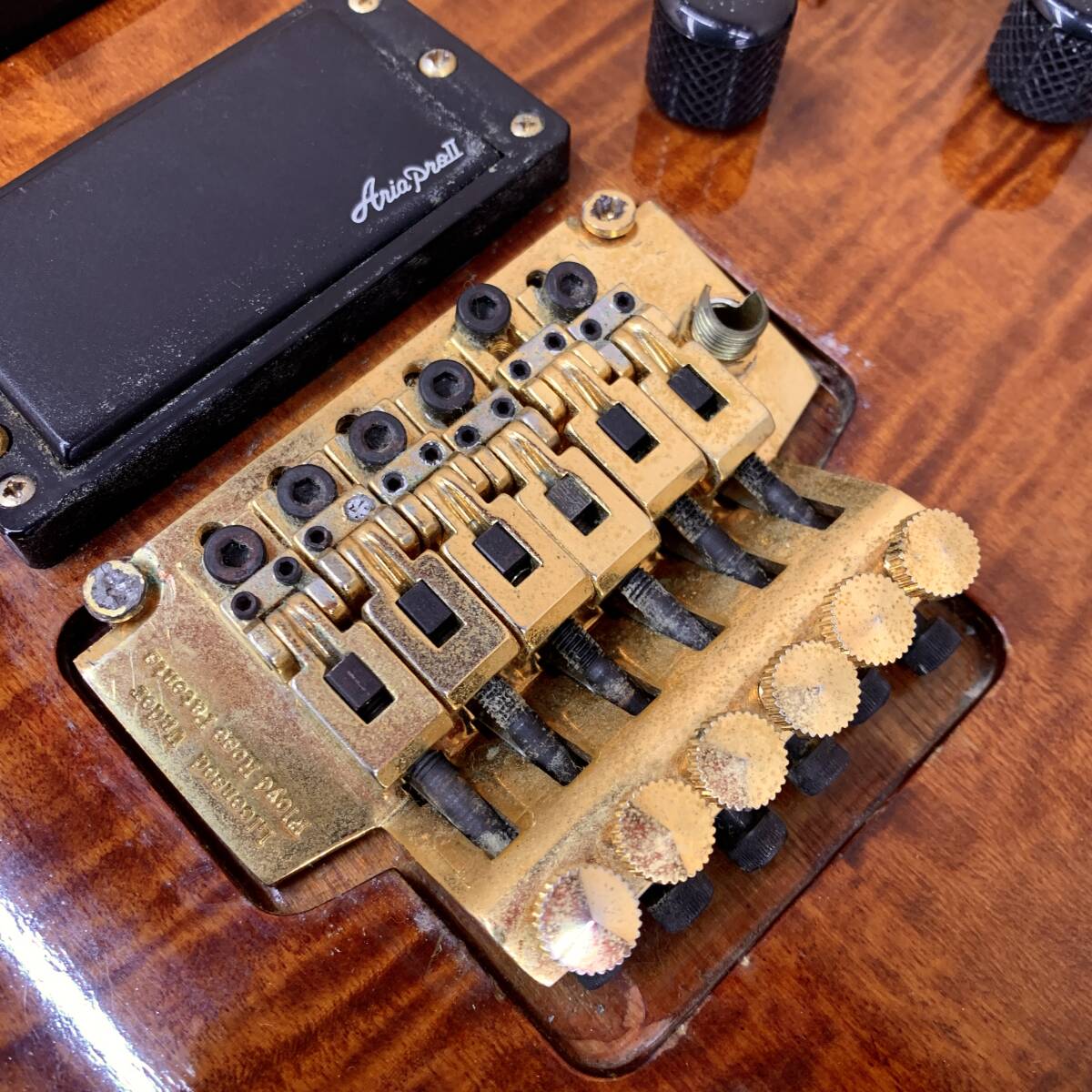 各部パーツがかなり劣化しており、ブリッジはアンカー部が破損し、弦高等の調整が難しく、アーム取り付け穴も破損しており、インサートブロックも恐らく交換され、一部割れております。
