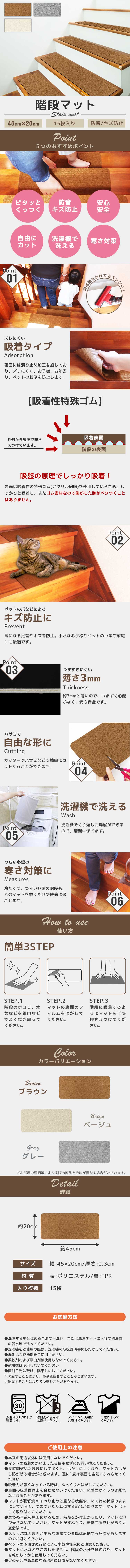 \ ズレない・防音・キズ防止の3拍子階段マット / ズレにくい吸着タイプ!! 裏面には滑り止め加工を施しておりズレにくく お子様、お年寄り、ペットの転倒を防止します! 吸着性特殊ゴム採用!!! 裏面は吸着性の高い特殊ゴム(アクリル樹脂)を使用しているため しっかりと吸着しまた、ゴム素材なので剥がした痕が残ることも ベタつくことはありません つらい冬の寒さ対策に!! 冷たくて、つらい冬場の階段もこのマットを敷くだけで 快適に過ごせます!! 【商品コード】FCF45BE 【商品詳細】 カラー:ベージュ サイズ(約):横45cm×縦20cm×厚み0.3cm 素材:ポリエステル、TPR 【内容】 本体×15枚 【注意事項】 ・マットの吸着力が弱まったら使用せずお買い換えください。 ・長時間敷いたままにしておくと、剥がしにくくなりマットの剥がし痕が残る場合がございます。 週に1度は裏面を空気に触れさせてください。 ・吸着力が強くなっているときは、ゆっくりと剥がしてください。 ・スリッパなどの裏面が平らな履物での昇降は転倒する危険があります。 ・洗濯する場合は、ぬるま湯で手洗いまたは選択ネットに入れて洗濯機の弱水流で洗ってください。 ・商品は、モニターによって色合いが異なって見える場合があります。 ・仕様・デザインは改良のため予告なく変更することがあります。 【もちろん新品未使用品です】 |