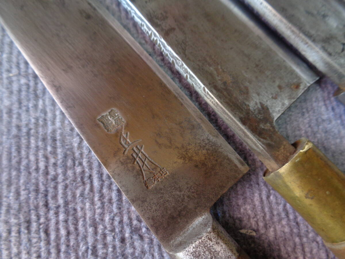 ②  築正本銘   出刃  刃渡り約20cm/全長約35cm  かなり使用感あり、サビ痕多い。柄の劣化。