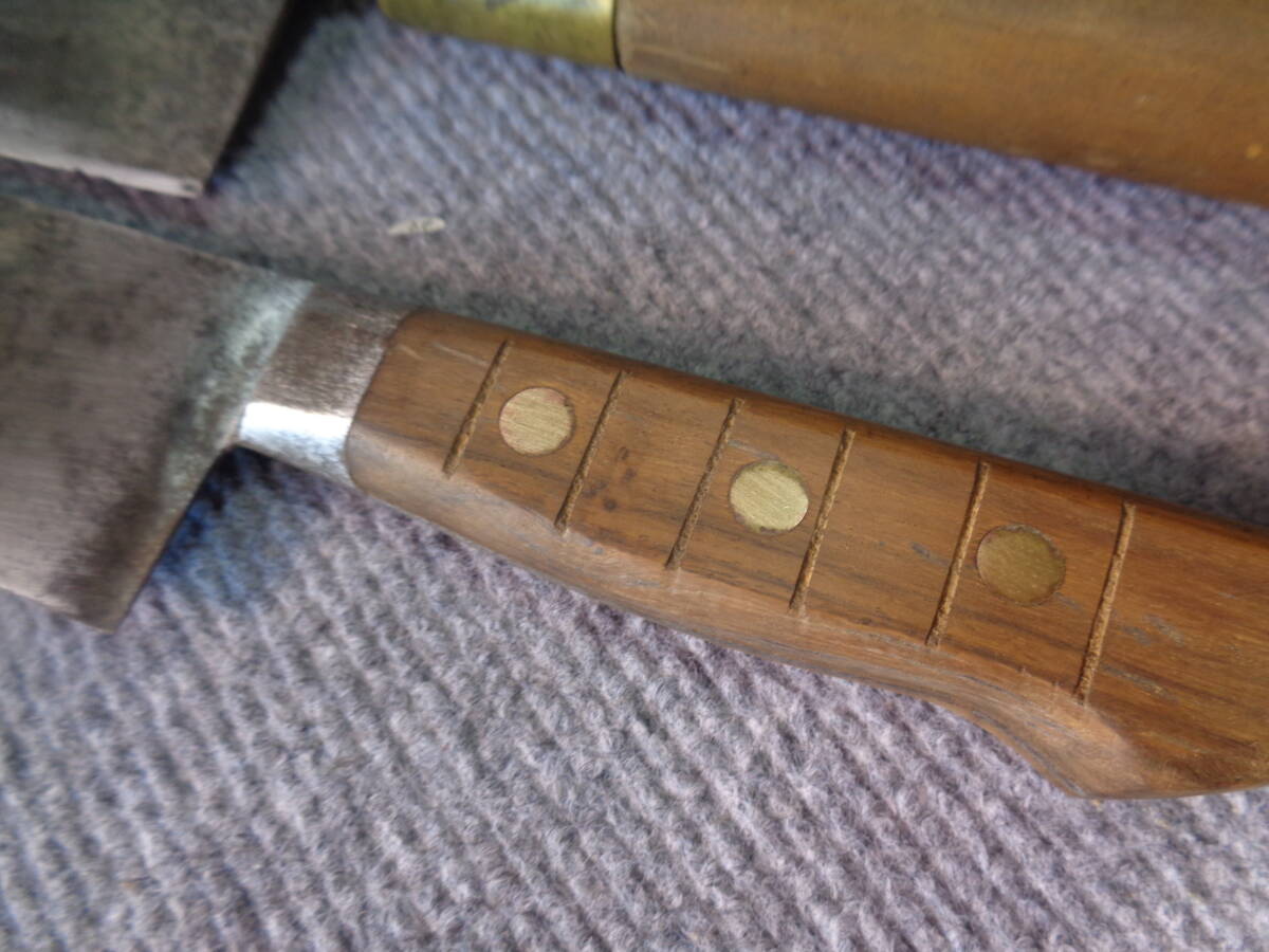 ①  正本銘   万能包丁  刃渡り約26cm/全長約39cm  かなり使用感あり。サビ痕多い。柄の切り込みあります。