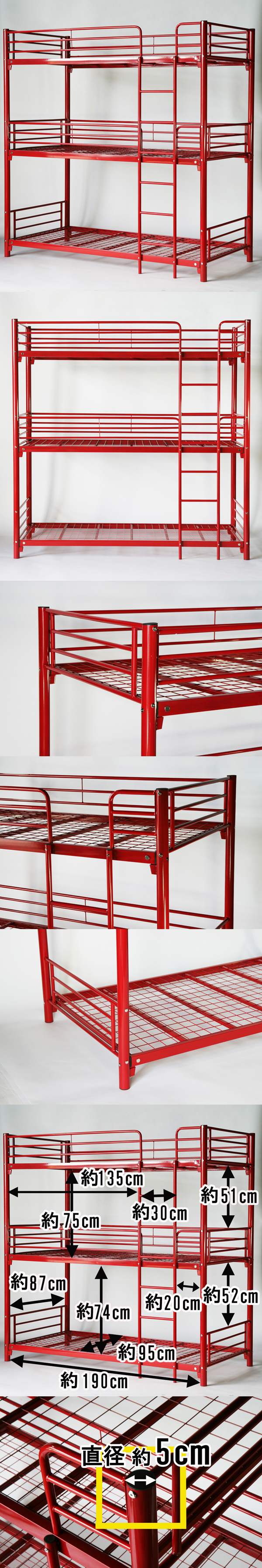 | 商品紹介 | ○三段ベッド!! ●パイプの柱の直径が、約5cmもあり丈夫で安定感のある構造の三段ベッドです ○丈夫な作りなので、お子様にも安心してご使用頂けます。 ※こちらの商品は、組み立て式です。(大人2名以上で、組み立て出来ます。) |