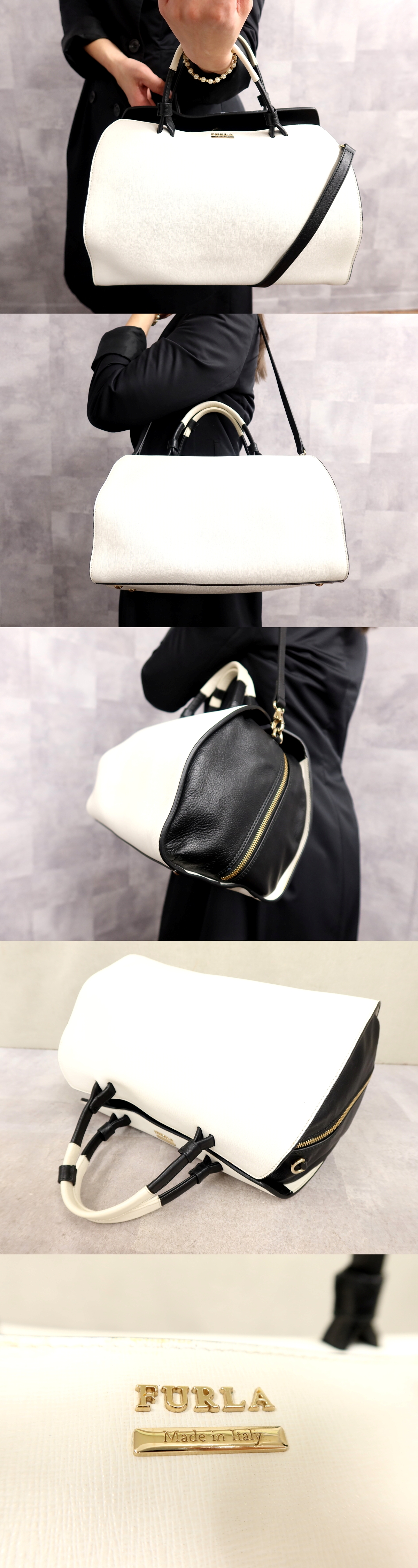 ●超美品●FURLA フルラ●ロゴ金具●バイカラー●カーフ レザー 本革●2way ハンド バッグ●白 黒●ゴールド金具●B5 収納 かばん●Js65137
