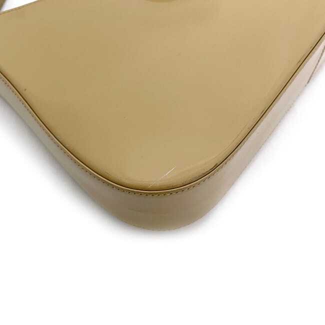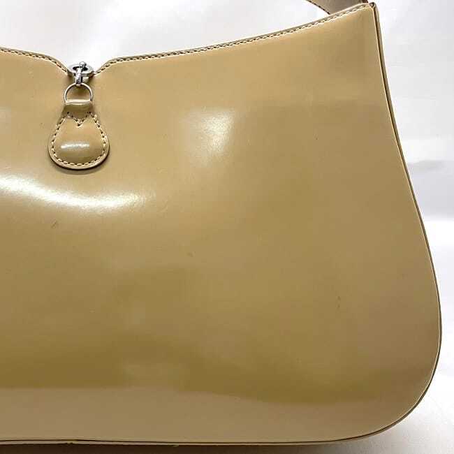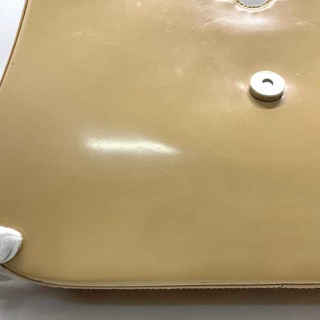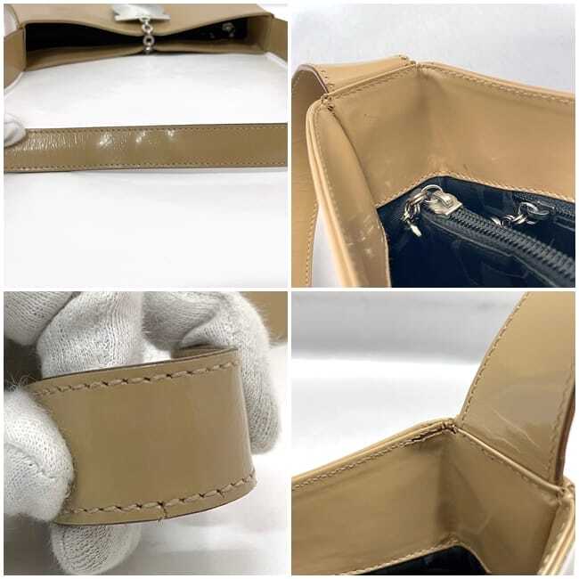 詳細説明 | ショルダー紐に皺や僅かにひび割れ、底部の角に擦れ、表面に薄傷や薄汚れ、金具に傷、内側上部縁サイドに1cm程のホツレ有、使用感はございますが比較的綺麗なお品物です。 |