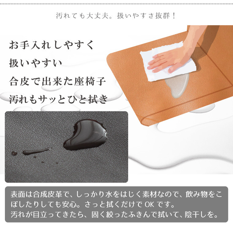 | ・PUレザーは、水をはじく素材です。普段のお手入れはサッとひと拭き。汚れが目立ってきたら、固く絞ったふきんで拭いて陰干ししてください。 ・お手入れの際、長時間水に濡れるとシミの原因となる場合がございます。十分にご注意ください。 | |