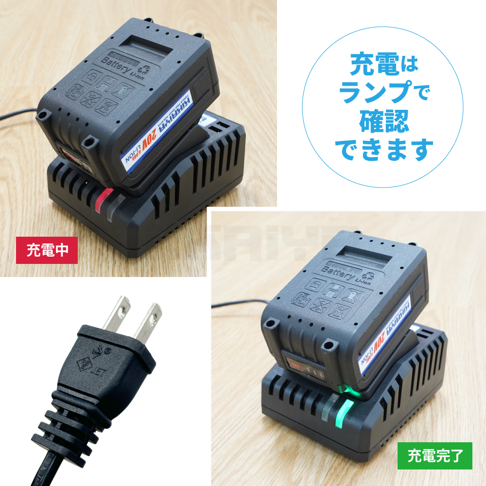 ●20V 4.0Ah リチウムイオンバッテリー(EIM-20V-P)に使える充電器です ●電源に接続すると緑のランプが点灯します ●バッテリー充電中は赤いランプが点灯し、充電が完了すると緑のランプが点灯します |