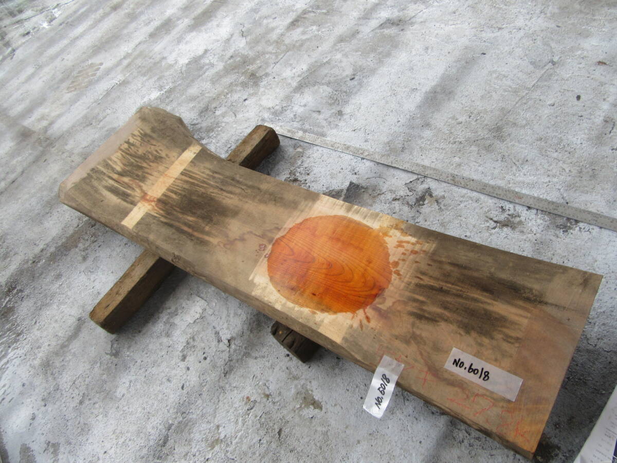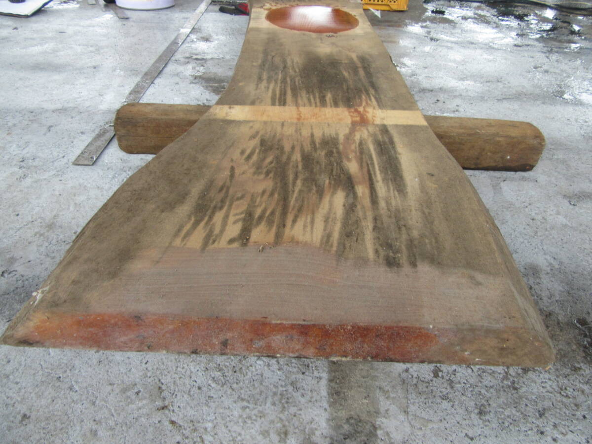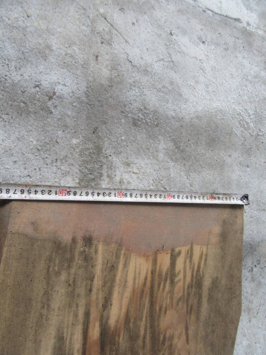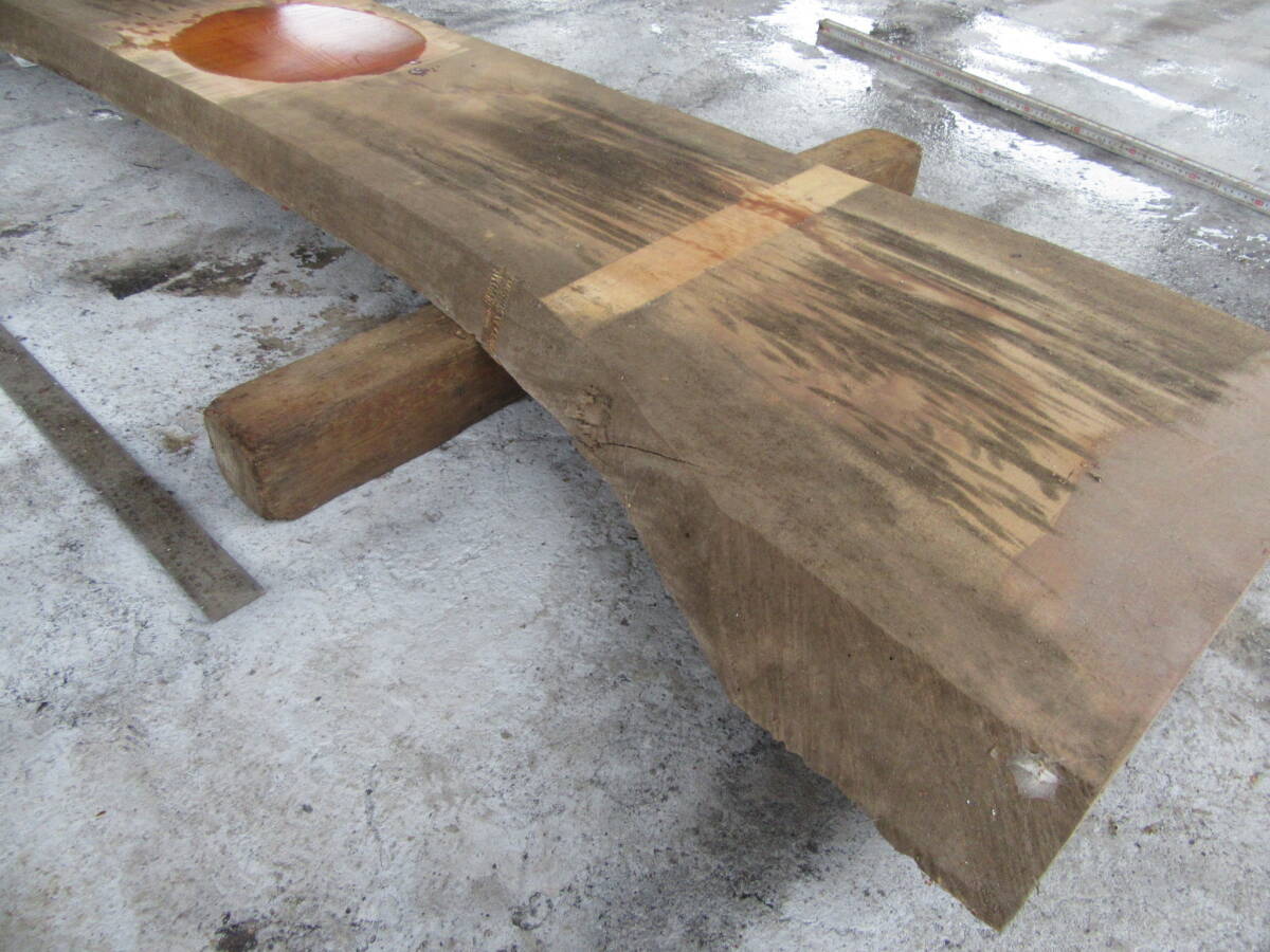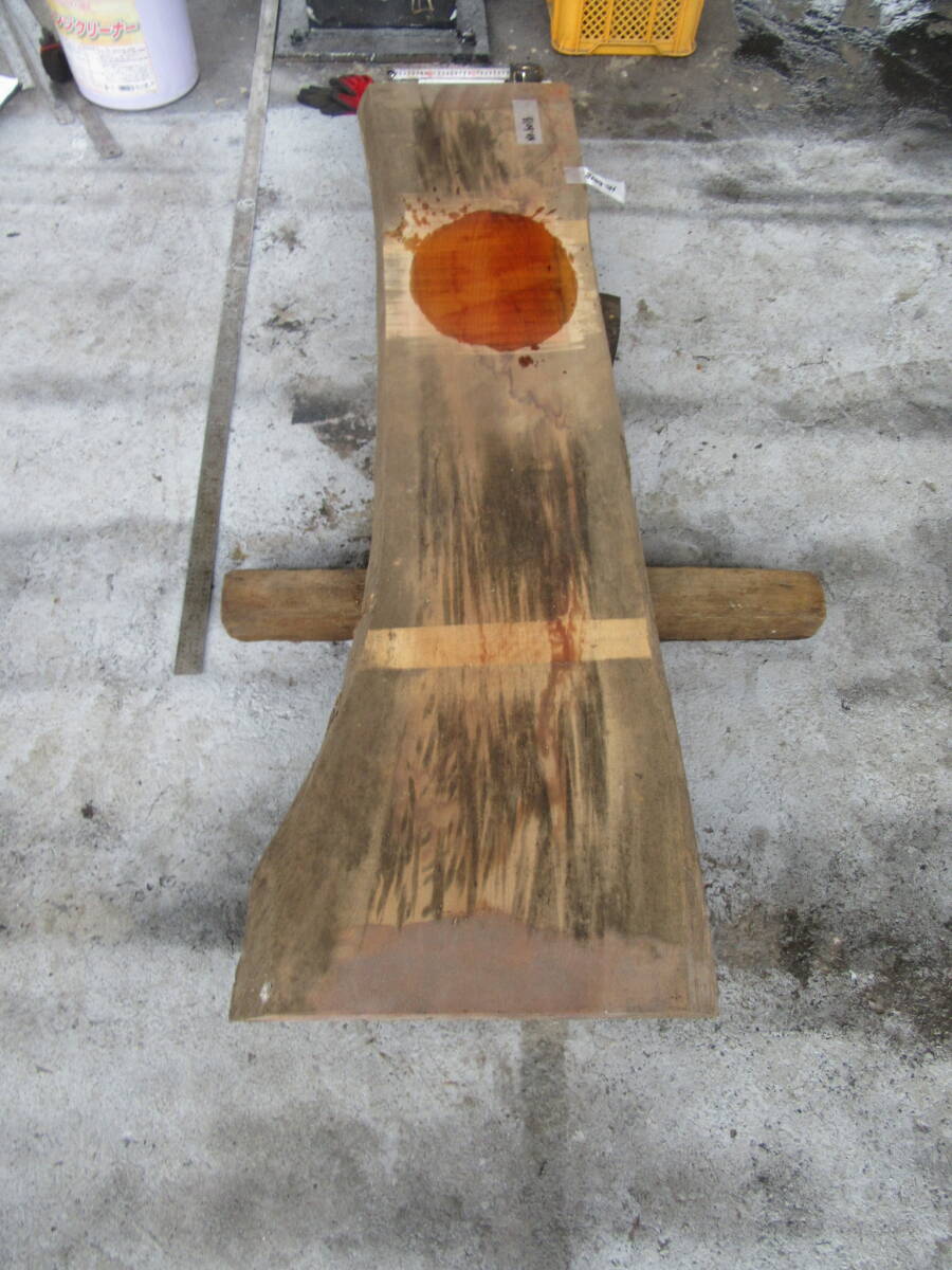 在庫は1本。 一部分削ってみました。 水をかけてウレタン樹脂を塗った時を再現したつもりです。 色目と年輪もきれいです。  テーブルの天板やDIYの工作材料にどんぴしゃ! 看板用の彫刻材にもいいかも入れん。  自然の風合いもばっちりです。 四角く製材した板よりもこの耳付きのやつのほうが雰囲気あるとおもいます!