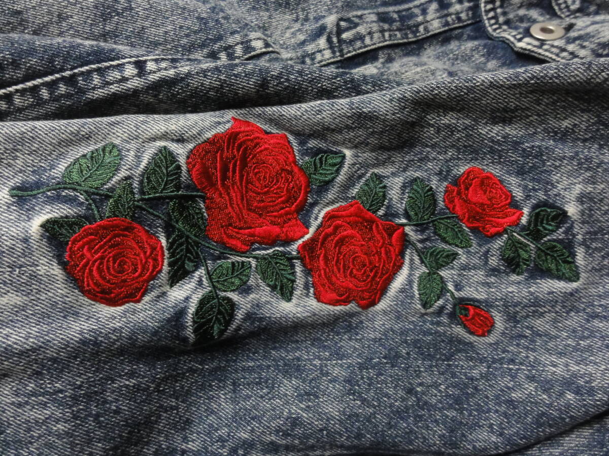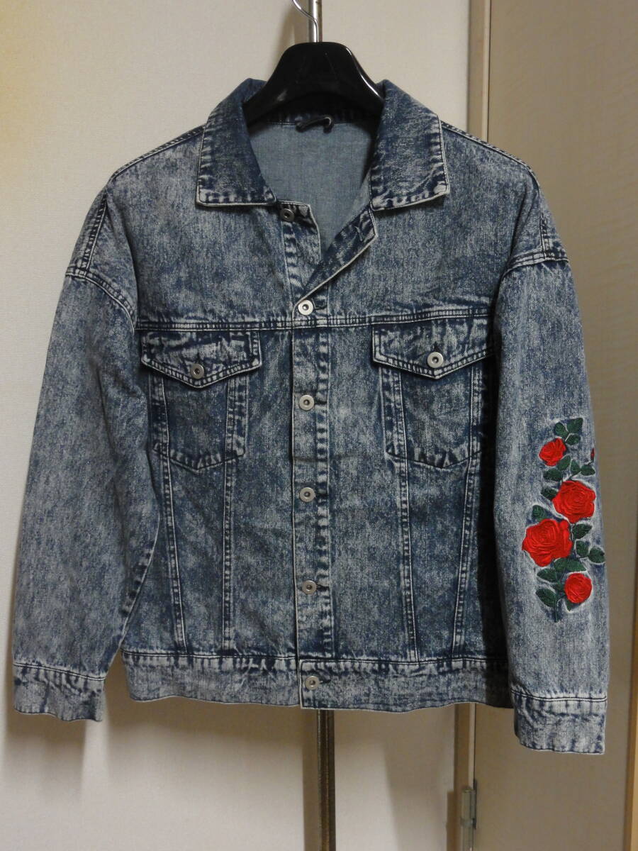 格安(胸囲120cm位)レア・アンティローザ・ダメージ加工デニム地・袖部に豪華な薔薇バラ刺繍デザイン付き・高級ジージャン系ブルゾン L位になります。