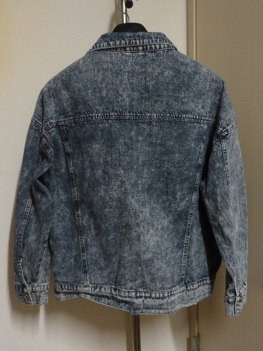 格安(胸囲120cm位)レア・アンティローザ・ダメージ加工デニム地・袖部に豪華な薔薇バラ刺繍デザイン付き・高級ジージャン系ブルゾン L位