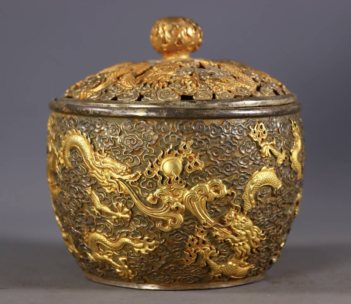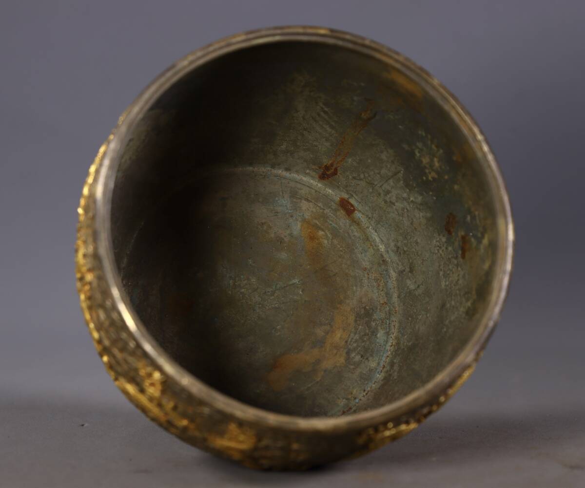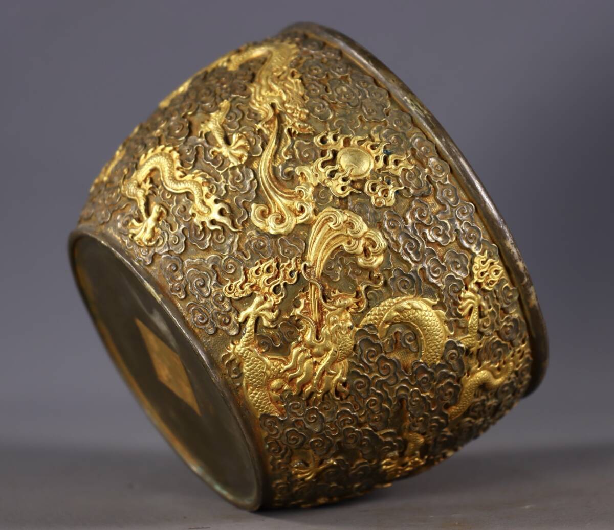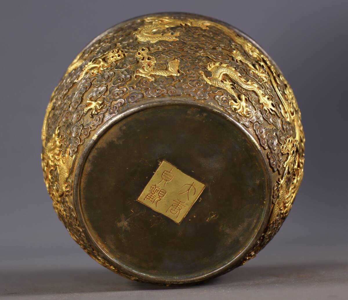 *珍品旧蔵* 清 局部塗金 高浮彫 鏨刻 盤龍コオロギ匹罐 銅製 極細工 唐物 中国古玩 骨董品 古美味 H45