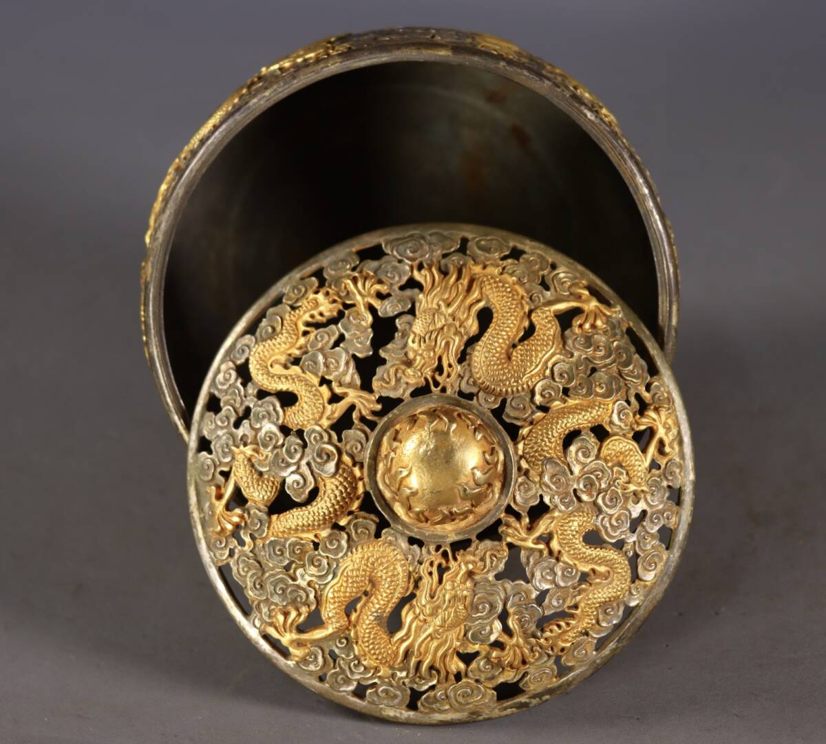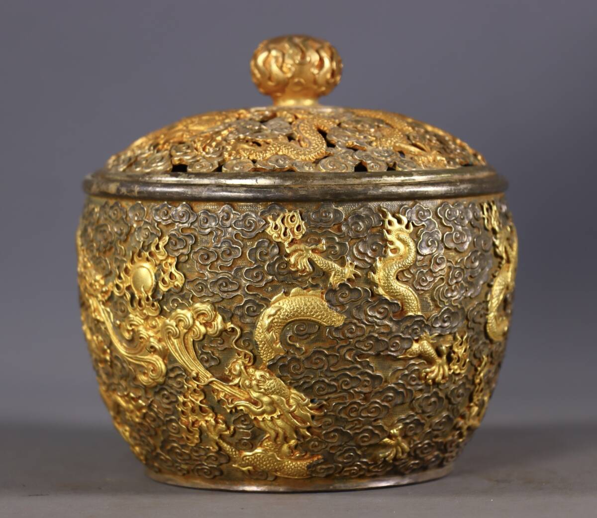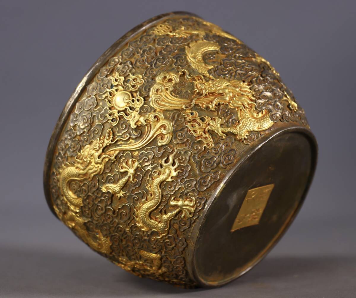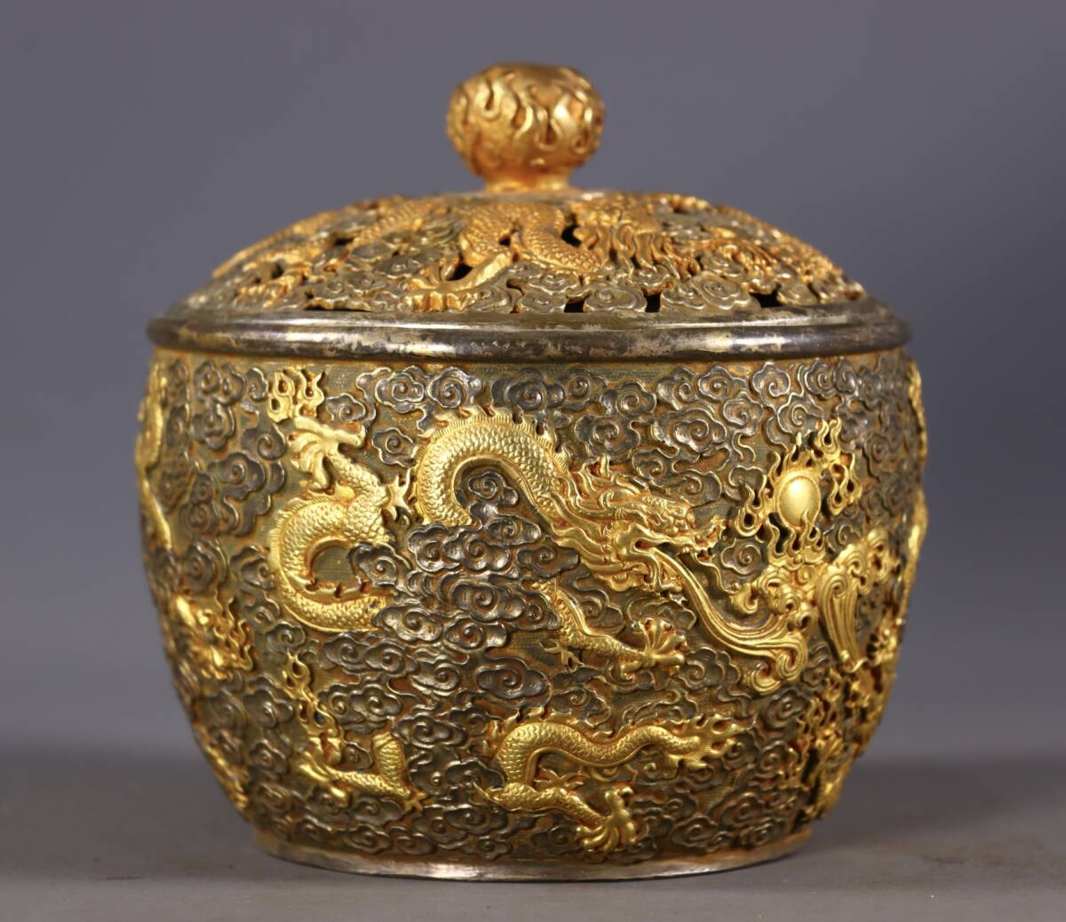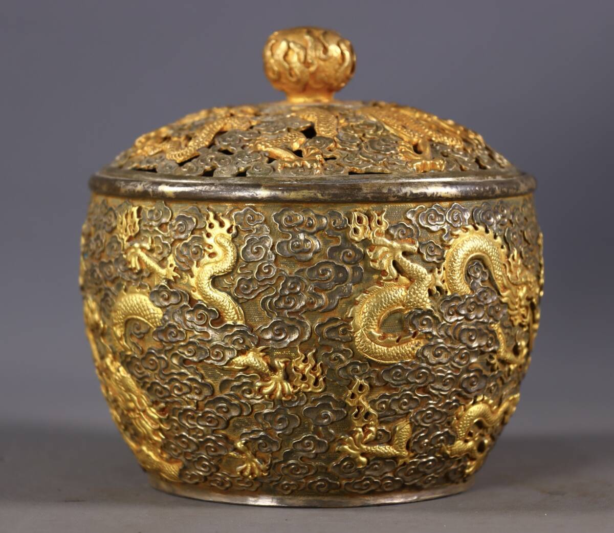 *珍品旧蔵* 清 局部塗金 高浮彫 鏨刻 盤龍コオロギ匹罐 銅製 極細工 唐物 中国古玩 骨董品 古美味 H45