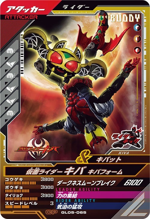 あらたに仮面ライダーバトルシリーズとして稼働が始まりました、仮面ライダーバトル・ガンバレジェンズよりCP キャンペーン GL05-065 仮面ライダーキバ キバフォーム&キバットのBuddyカードの出品になります。