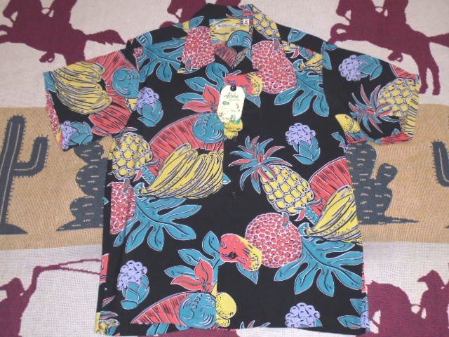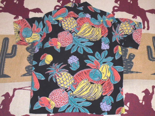 グアバ、リリコイ(パッションフルーツ)、パパイヤ、ブレッドフルーツ、パイナップルといったハワイを代表するフルーツだけで構成されたアロハシャツらしい一枚。アメリカ本土から来た観光客にとって、ハワイでの滞在期間に食べた南国の果物は印象深く旅の思い出のひとつとなる。数あるアロハシャツのモチーフの中でも、パイナップルなどをモチーフとした作品は地元の人たちにも非常に人気があり、いくつものデザインが製作された。