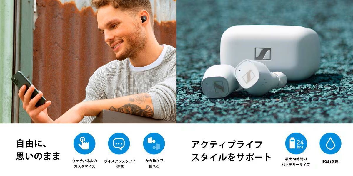 | 商品説明 | ゼンハイザー SENNHEISER 完全ワイヤレスイヤホン CX Plus True Wireless 【モデル名:CXPLUSTW1 white】 509189 [Bluetooth/ANC=アクティブノイズキャンセリング対応/aptX(TM) Adaptive] です。 国内大手家電量販店(ゼンハイザーの正規販売代理店)購入の新品未開封品です。 メーカー保証書未記入に販売店保証明細付属。 即決です。消費税はかかりません。2026年9月まで保証付。 1点限りになります。 ◆製品 【ゼンハイザーの音質に『妥協』の文字はない】 75年以上もの間、世界中のミュージシャンやプロのサウンドエンジニア、 オーディオ愛好家から確かな信頼と支持を得ているゼンハイザー。 確かなオーディオ技術と豊富な知識を持つドイツ本社で開発した TrueResponse(トゥルーレスポンス)トランスデューサーは最上位機種の Momentum True Wireless 2と同等のハイエンドなトランスデューサーを採用。 高性能シングルダイナミックドライバーで奏でる高解像度のサウンドを全帯域で実現。 質の高いリスニング体験の提供に徹底してこだわる ゼンハイザーならではのサウンドクオリティ、今まで感じたことのない音質をその耳に。 【ハイレゾ相当の高音質コーデック『aptX(TM) Adaptive』 】 ゼンハイザーの高音質をワイヤレスイヤホンで今までよりも快適に、 今まで以上に楽しんでもらえるようにSBC, AAC, aptX(TM)に加えて、 近年様々なスマートフォンにも搭載され始めて注目が高まっている クアルコム社のaptX(TM) Adaptiveが追加されました。 最新aptX(TM) Adaptive搭載で24bitに対応* (従来のaptXは16bit)。 ダイナミックレンジが更に広がり、ゼンハイザーサウンドがネクストステージへ。 【低遅延で音切れしにくい、”つながる”高音質 】 TrueWireless Mirroring(トゥルーワイヤレスミラーリング)と aptX(TM) Adaptiveを搭載したクアルコム社製チップは ハイレゾ相当のコーデックだけでなく、 それを心地よく聴くためのサポート面も大幅に向上。 なかでもaptX(TM) Adaptiveは場所や時間による混雑具合や 接続状況に合わせて転送データを自動調整することにより、 省電力に加えて低遅延で音途切れしにくいパフォーマンスを実現。 満員電車や人通りの多い場所などや、 電波状況に応じて音切れしないことを優先して、効率的にデータ転送を抑えます。 場所を選ばず高音質を日常の中で今までよりも『当たり前』に感じることができる 画期的な新技術の搭載。 ゼンハイザーの培った確かな音質と最高峰のテクノロジーの融合で ワイヤレスイヤホンの音質をさらなる高みへ誘います。 *(ご注意)*aptX(TM) Adaptiveは スマートフォン側も対応していることが条件です。 【アクティブノイズキャンセリング(ANC)で、音楽だけを身に纏う】 いつでもどこでも周囲の音を遮断して音楽だけを感じることができる アクティブノイズキャンセリング。 圧迫感のない自然な効果でサウンドを際立たせるので、 駅や高架下、カフェ、人混みの中、どこでも周囲の音を遮断して 音楽だけの時間と空間を演出。 フィット感の高いイヤホンが創出するパッシブノイズアイソレーションと ANC でさらにノイズを周囲の音を遮断するので邪魔は入りません。 キレのある低域から繊細な高域まで、上質なサウンドだけを身に纏う。 操作はイヤホンのタッチパネルを押すだけ、一瞬で優雅な音楽体験へ。 【周囲の音が聞こえる、気づく、外音取り込み機能】 一方で、周囲の音を聴くことができる外音取り込み機能で プライベートも仕事も毎日をもっと便利に手軽に。 軽く立ち寄ったお店でのショップスタッフとの会話、そばにいる友人やパートナー、 同僚との会話などもクリアに聴き取ることができます。 周囲の音を自然に取り入れ、イヤホンを付けていてるわずらわしさはありません。 外音取り込み機能への切り替えも、アクティブノイズキャンセリングと同様、指一本。 タッチパネルを押すだけで切り替えできるので イヤホンを外す必要はありません。 【長時間通話やビジネスシーンで重宝する左右で可能な片耳使い】 長時間の通話やオンライン会議などで重宝する片耳使い。 片耳で通話しながらもう片方を充電できるので バッテリー切れの心配はありません。 スムーズで軽やかな左右の切り替えは、切り替えたいときに切り替えできる快適さで自宅、 会社、外出先と場所を選ばず自由自在。 これは片耳で音楽を聴いているときでもシームレスにスイッチできるので快適です。 【アクティブライフスタイルをサポートする防滴仕様 IPX4】 ~左右で可能な片耳使い 防滴仕様 IPX 4 エクササイズ、ワークアウト中にも音楽や通話を充分に楽しむ ライフスタイルにも高いパフォーマンスを感じてもらえるように、 CX Plus True Wireless は防滴仕様に。少しぐらいの雨、 運動中の汗にも心配は不要です。 【24時間バッテリー 通話音声 装着感 アプリとタッチパネル操作】 ・24時間バッテリーで、楽しさは一日中 ・抜群のフィット感でストレスフリー ・自由を与える万能アプリとイヤホンのスマートタッチコントロー