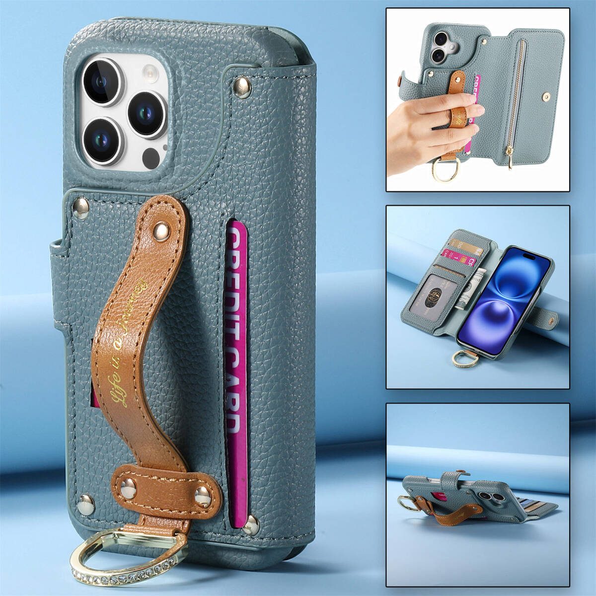 ブルー iPhone16pro Max用ケース 手帳型 RFID磁気防止 スキミング防止 カードポケット 落ち着いた色 横置き機能 高級PU 気質 全面保護