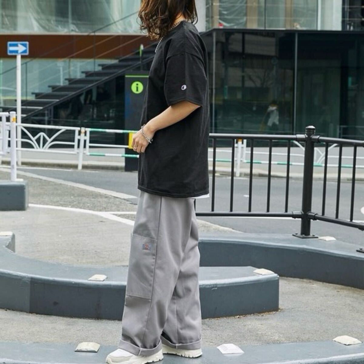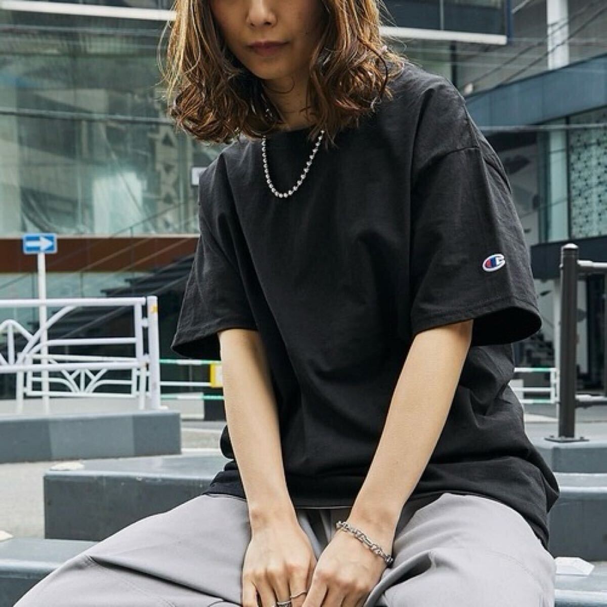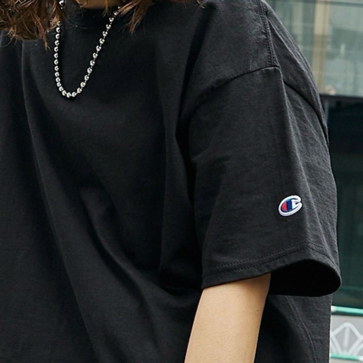 ・無地Tの中に左袖にワンポイントで施したチャンピオンのロゴワッペンが良いアクセントに
