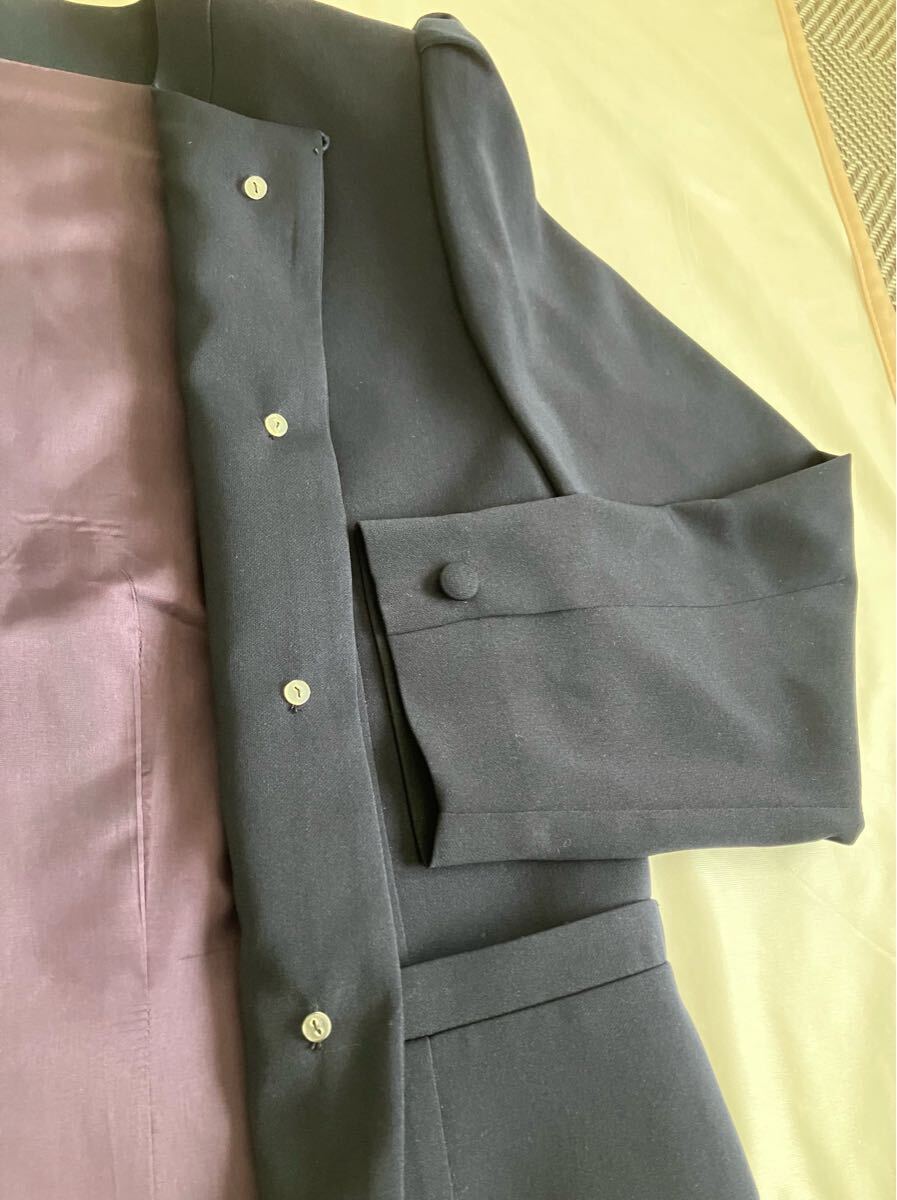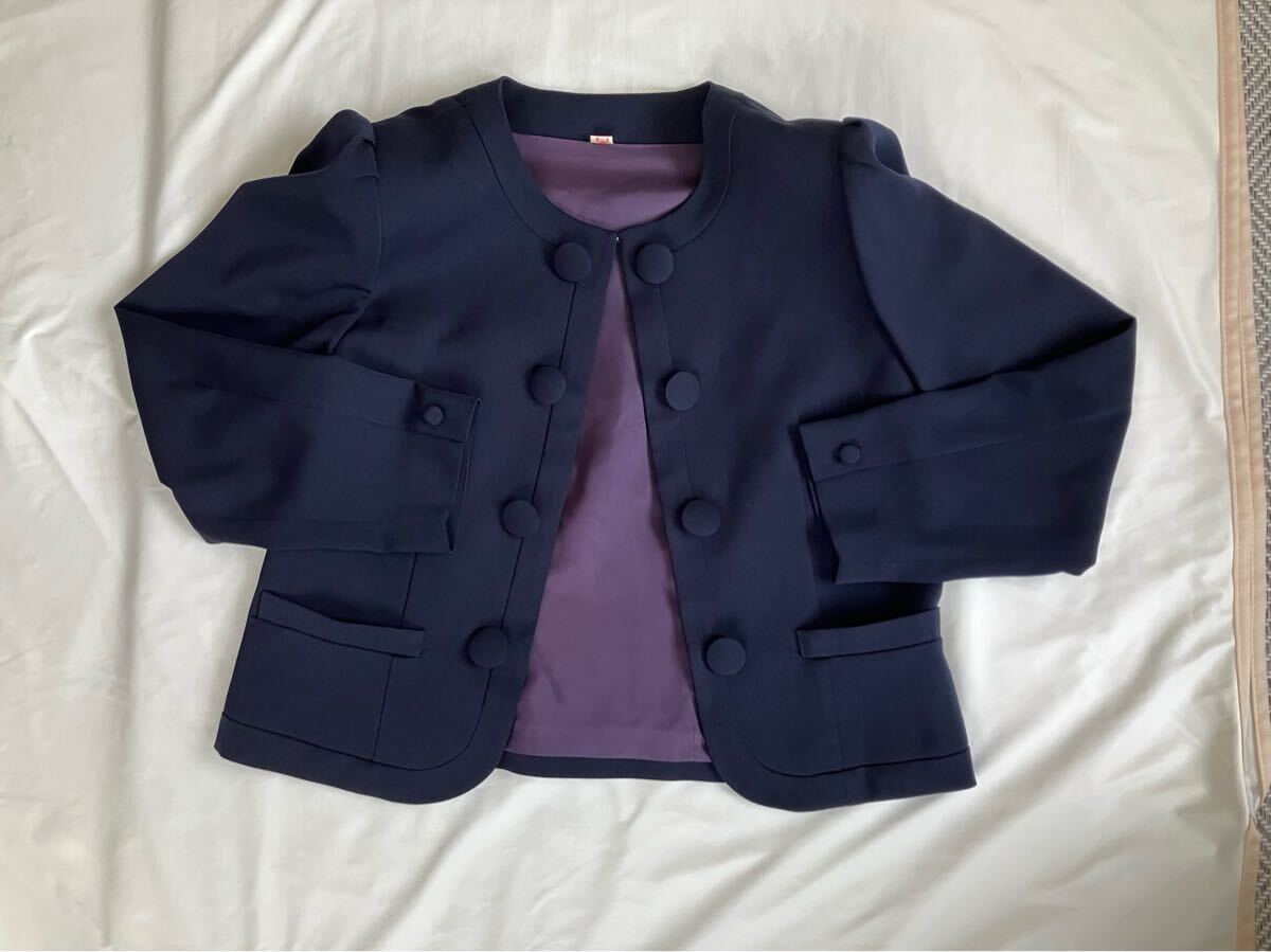 ジャケットの丸いボタンが特徴的なネイビーのセットアップスーツです!