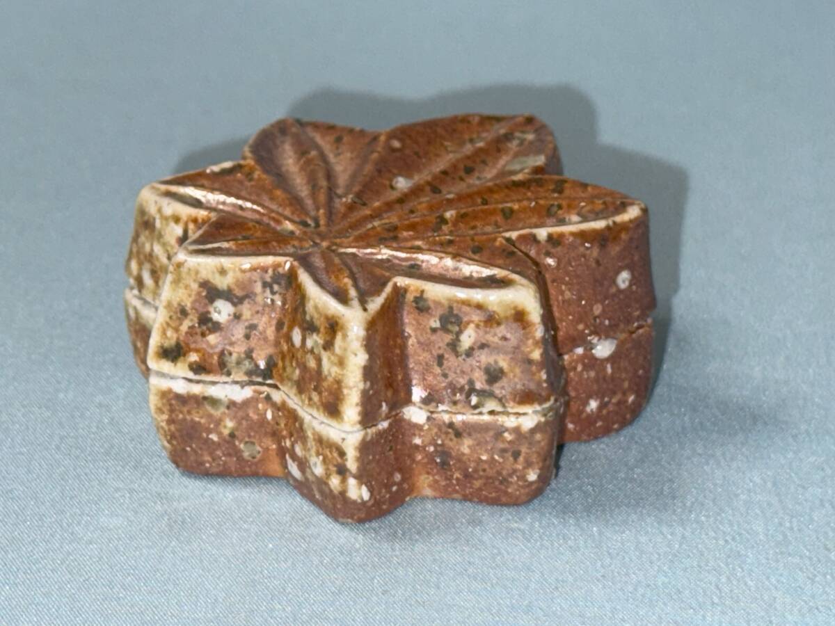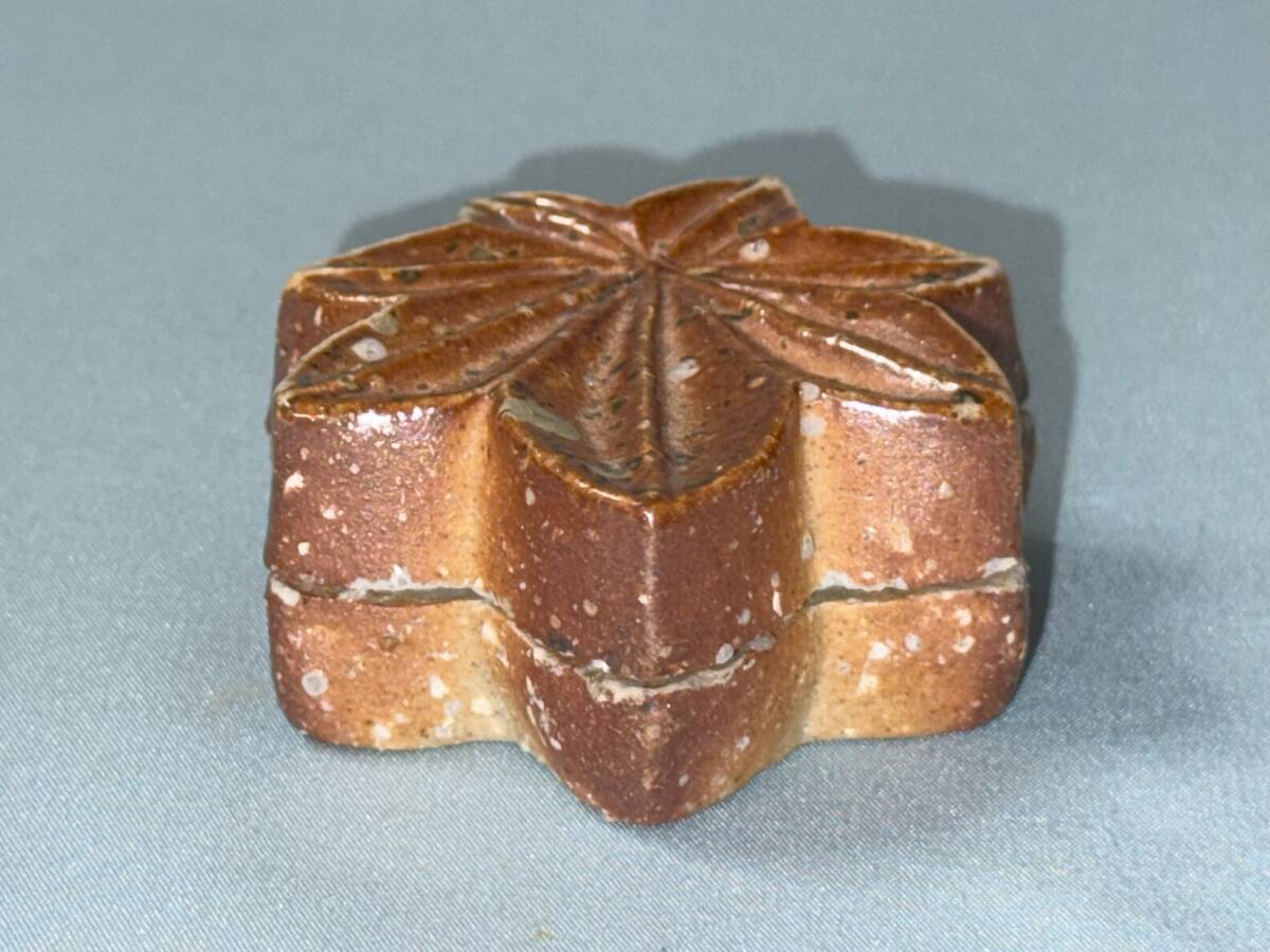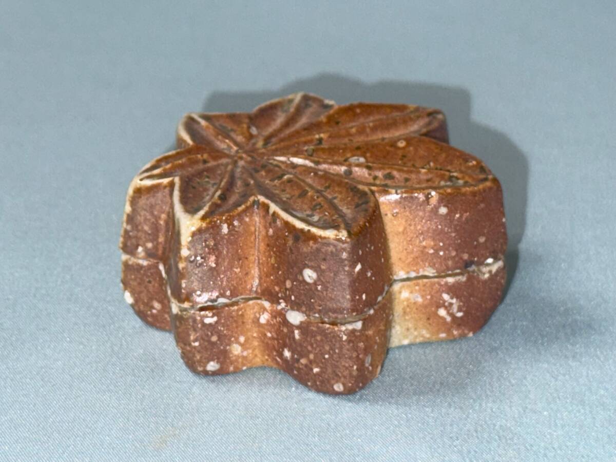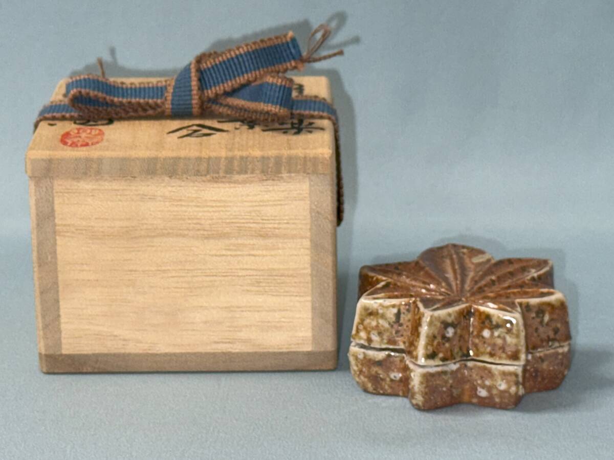 温かみのある火色(緋色)、自然釉と褐色肌が見事に調和し、紅葉の形をした可愛らしい信楽香合です。