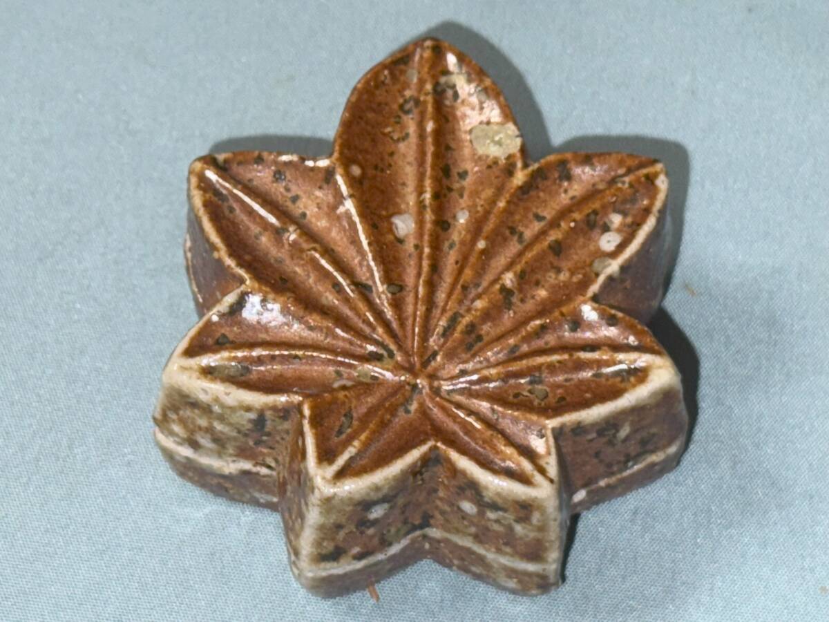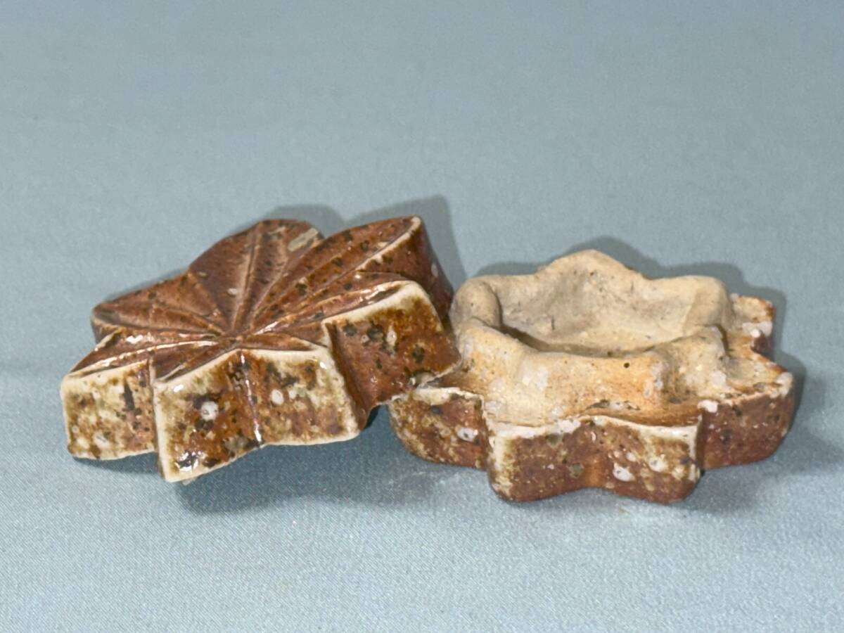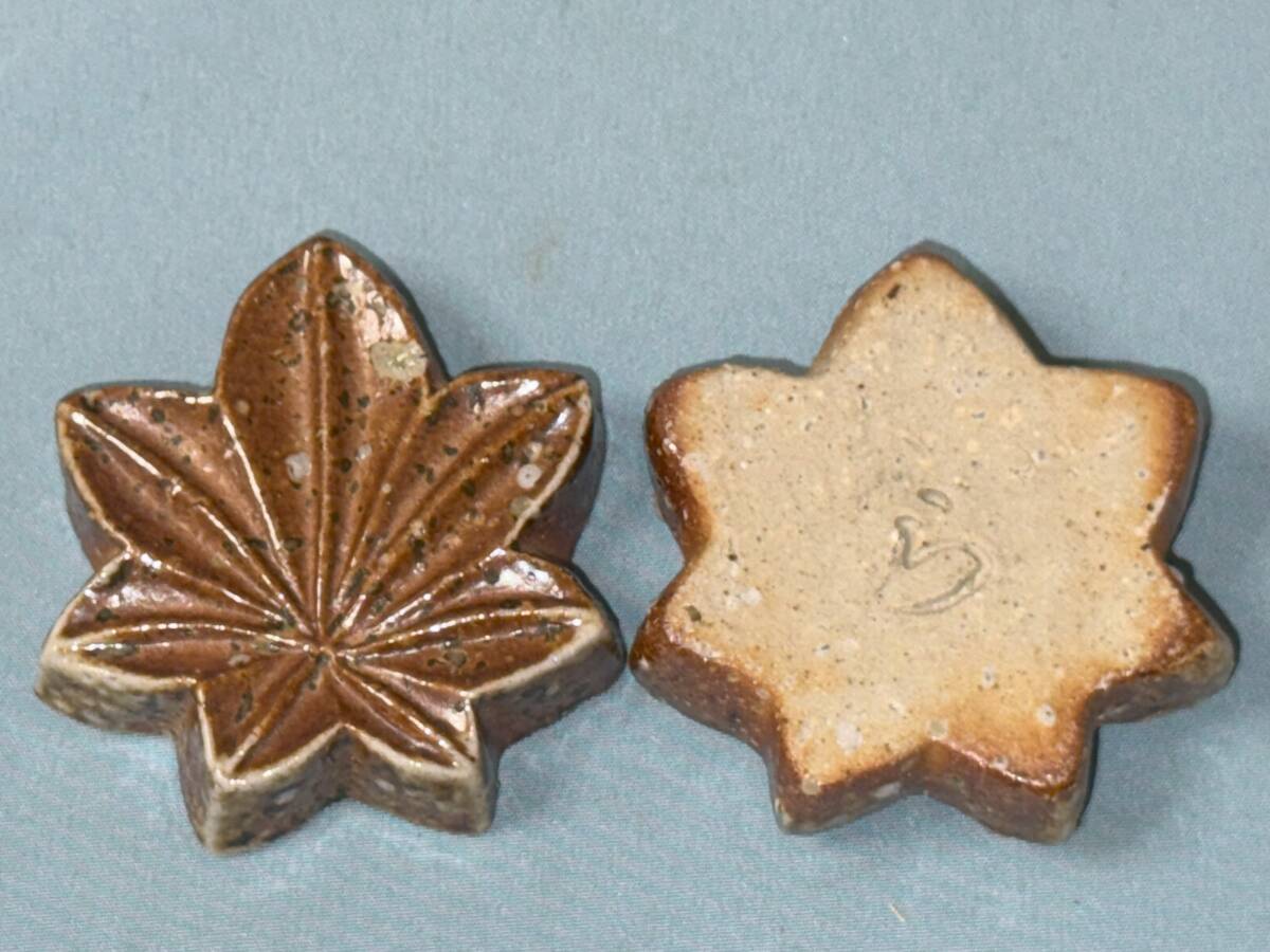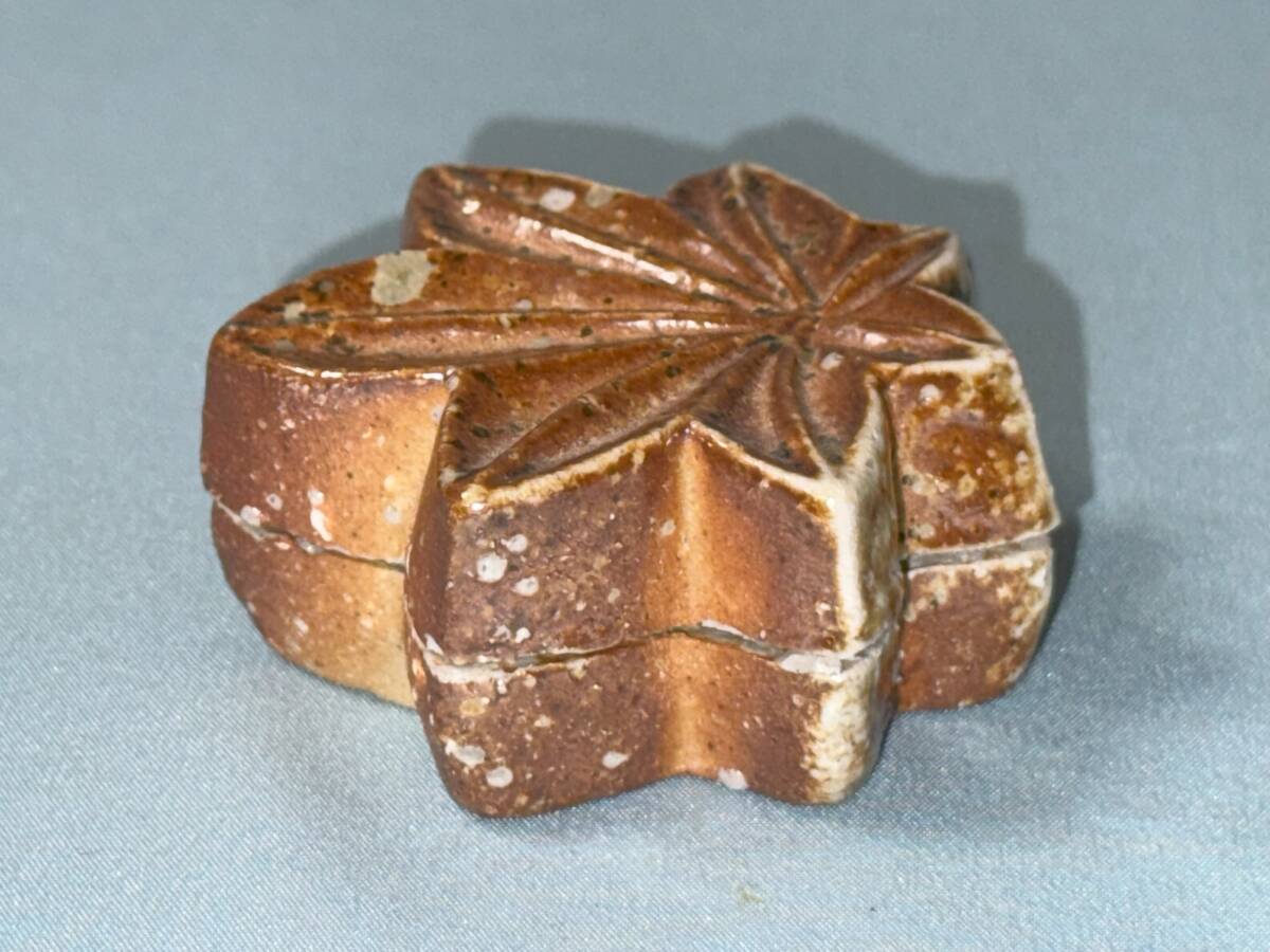 温かみのある火色(緋色)、自然釉と褐色肌が見事に調和し、紅葉の形をした可愛らしい信楽香合です。