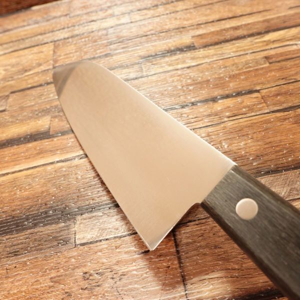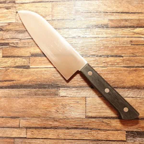 三徳包丁は、肉・魚・野菜すべてに対応する万能包丁で、家庭用に非常に人気があります。シンプルなステンレス(AH-40)の三徳包丁です。
