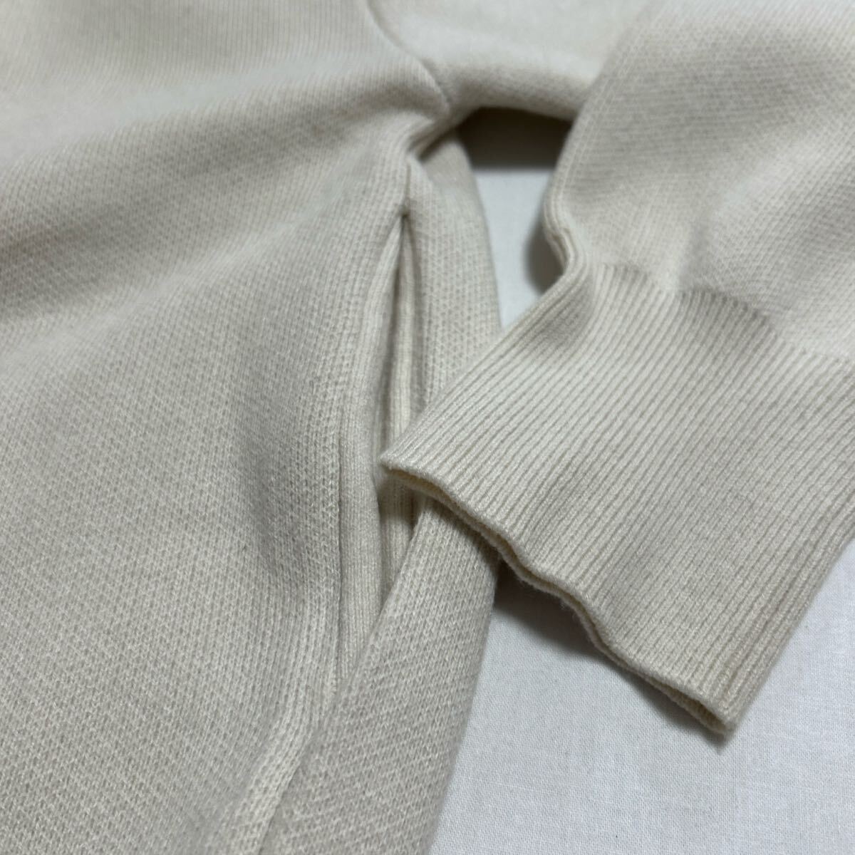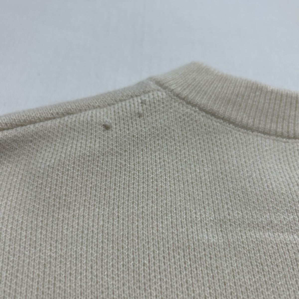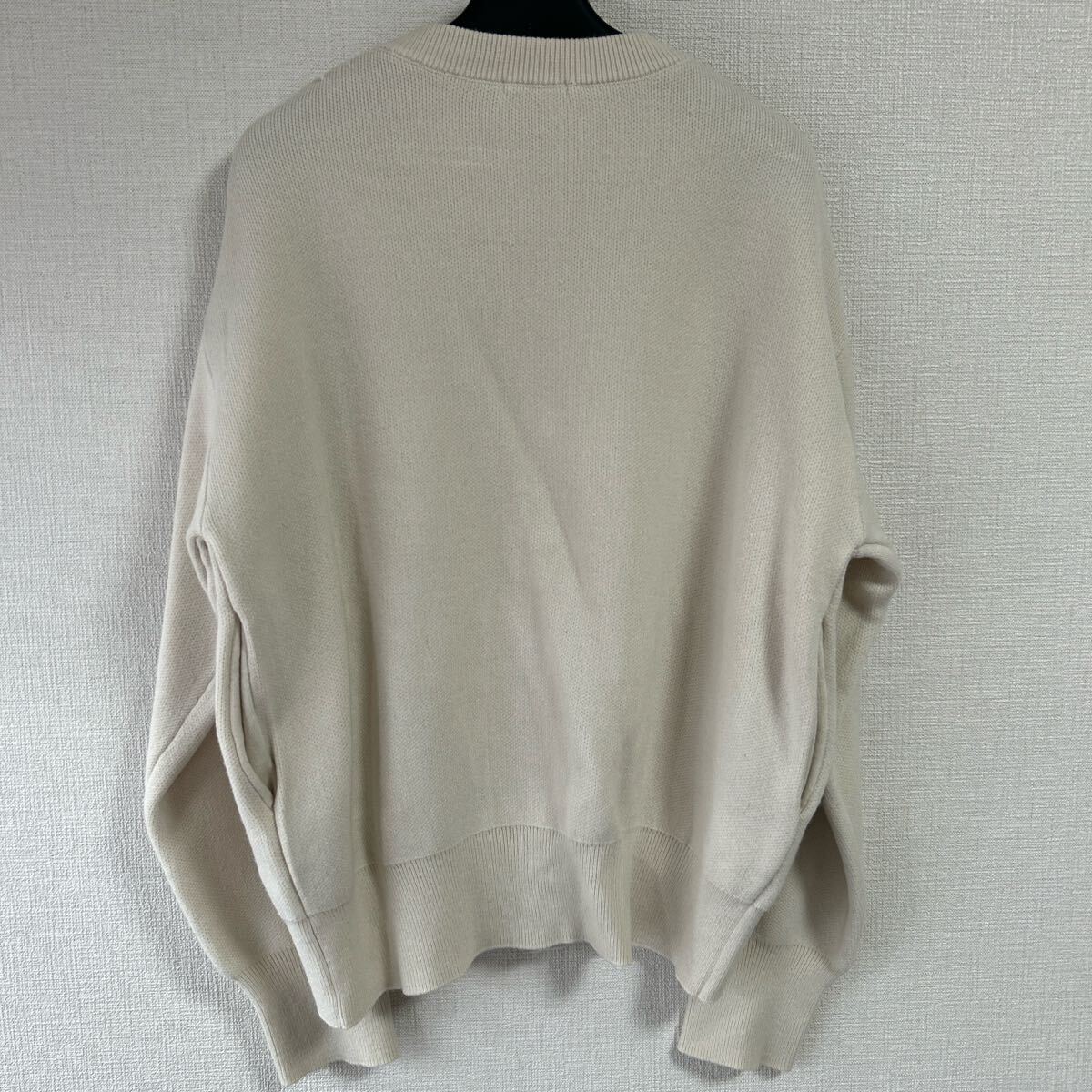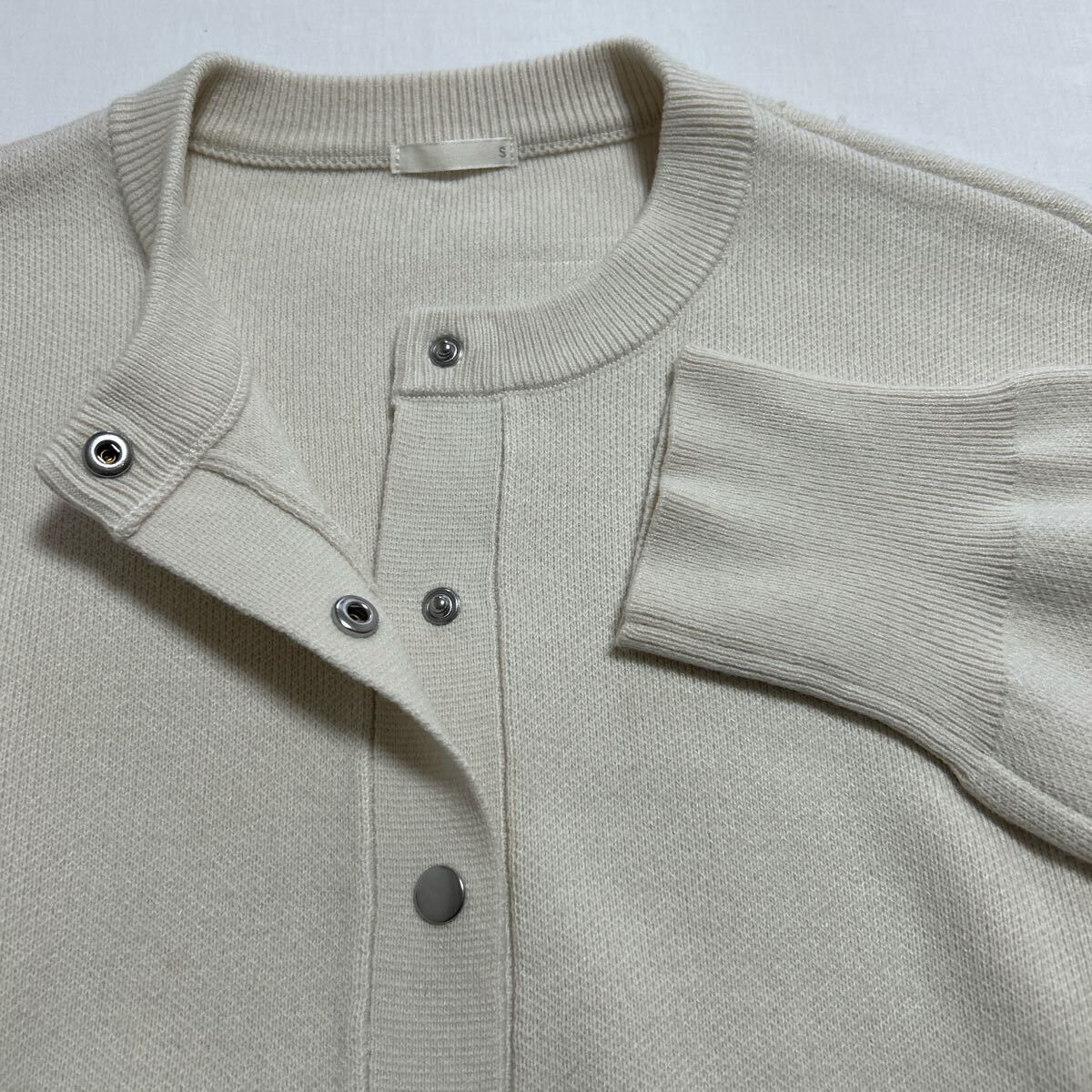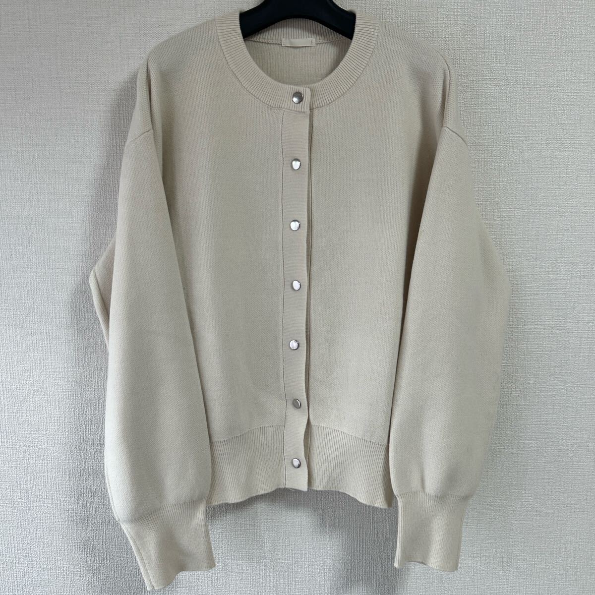 シルバーのボタンが特徴のベージュニットカーディガン。 - 色: ベージュ - デザイン: ボタン付きカーディガン - 素材: ニット - 袖のスタイル: ドロップショルダー - ボタンの色: シルバー 着丈55、身幅50、着丈48、袖丈52センチ。 左肩後ろ部分にツレがあります。(写真参照) その他きれいです。 ジャケットとして着ていただけます。 ご覧いただきありがとうございます。
