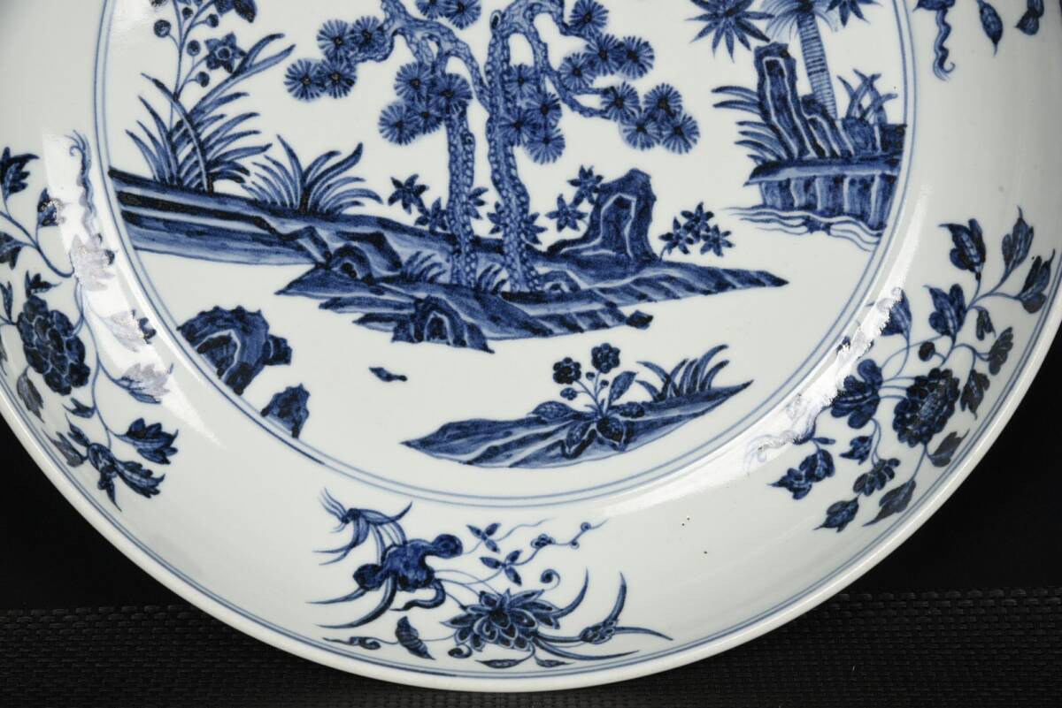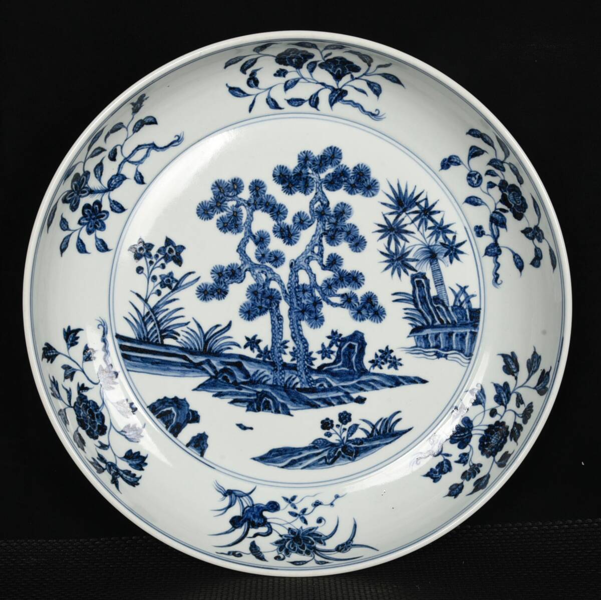 【仁】『明・永樂年製款・古陶瓷品・青花・松竹梅紋・供盤・陶藝』極細工 古賞物 古董品 中国古玩 古美術 古美味 時代物 旧家蔵出