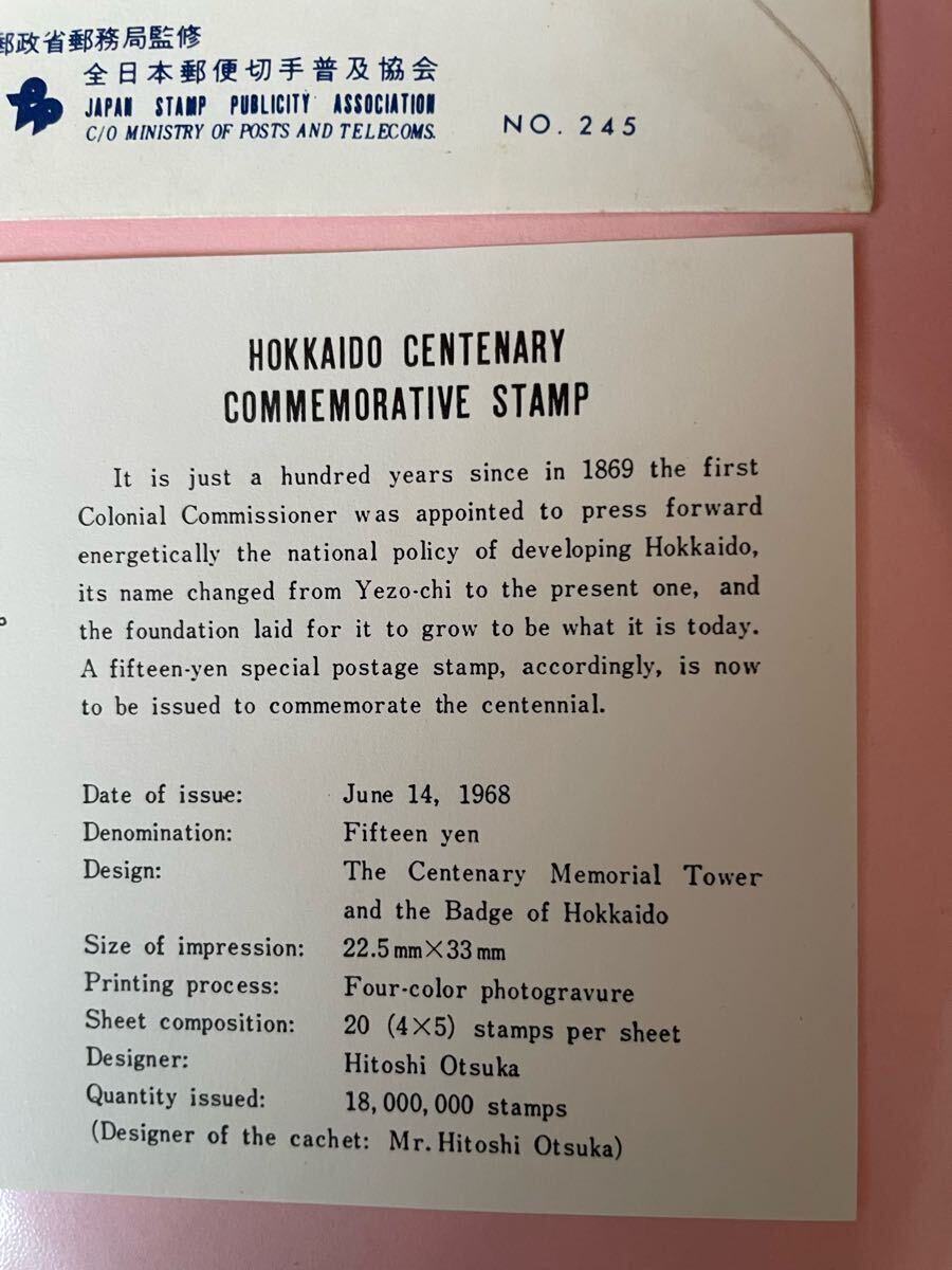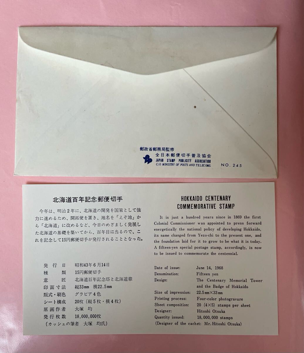 北海道百年記念  初日カバー FIRST DAY OF ISSUE 昭和43年