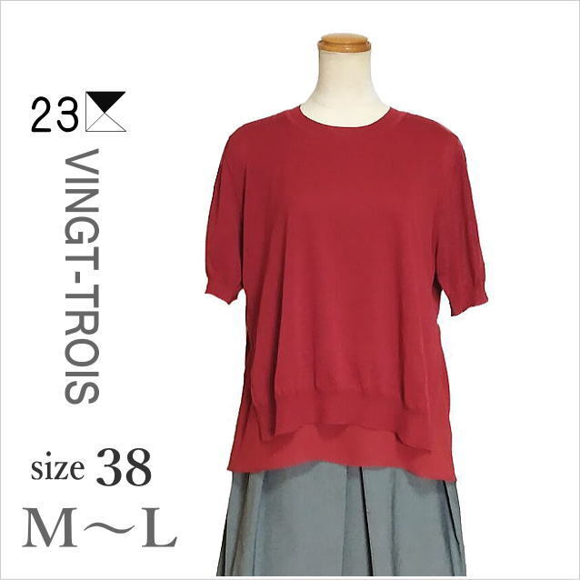 〔23区 VINGT-TROIS〕朱色系シフォン切替えトップス オンワード樫山 サマーニット 薄手 半袖 トップス レディース 38 M~L位 *送料込み