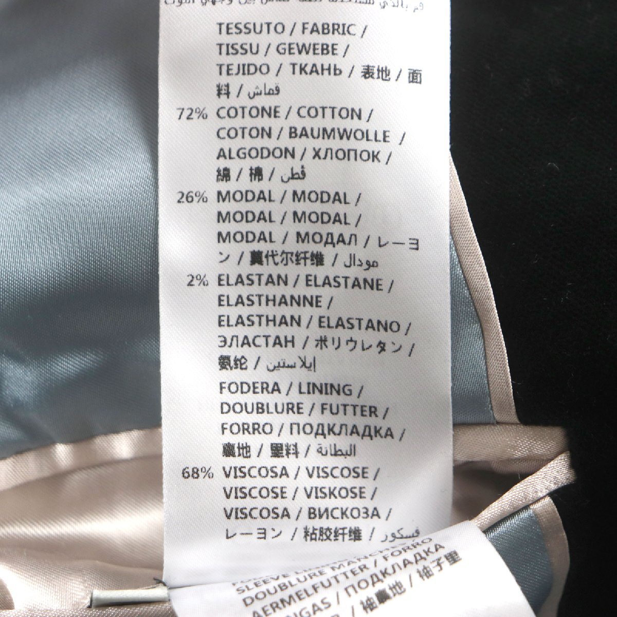 | 素材 (material) | 表地:コットン72% :レーヨン26% :ポリウレタン2% 裏地:レーヨン68% :シルク32% 袖裏地:キュプラ100% | ||||||||||||||||