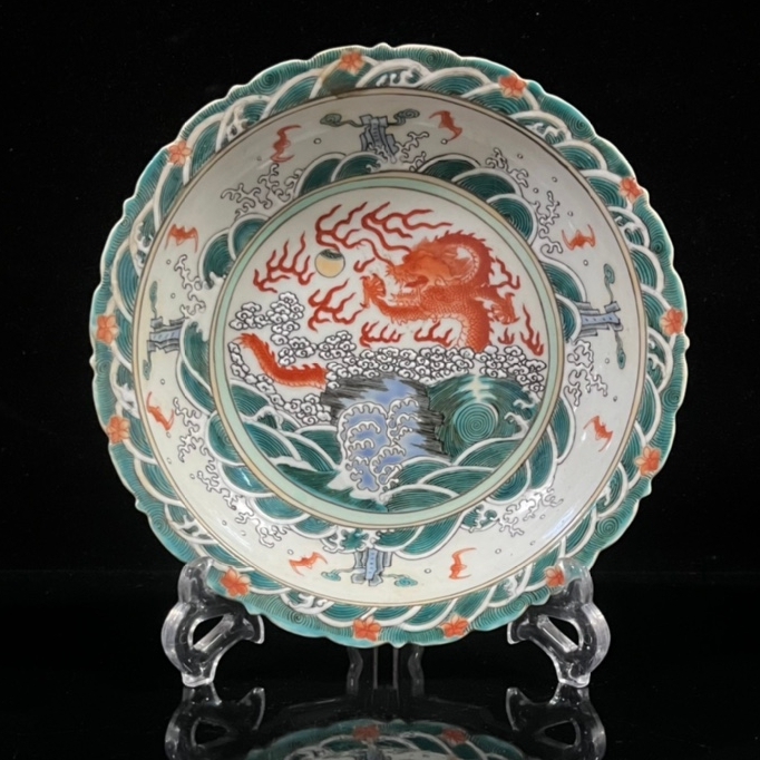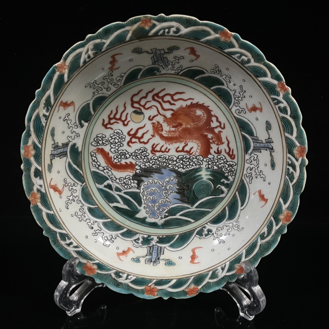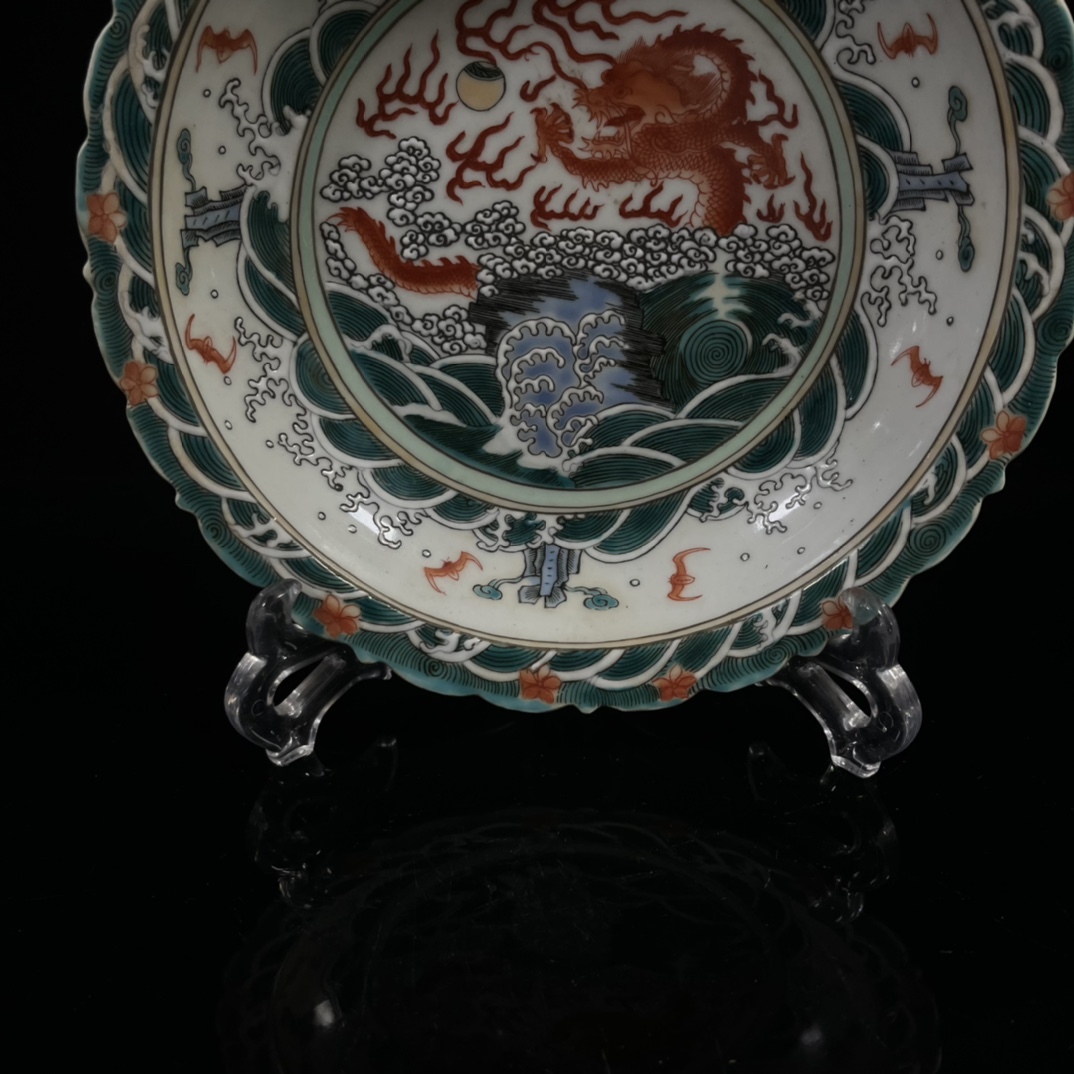 *珍品旧蔵* 大清 雍正年制款 五彩瓷龍出海紋飾 花邊盤子 陶芸 古陶磁器 中国磁器 極細工 唐物 中国古玩 骨董品 古美味 H45