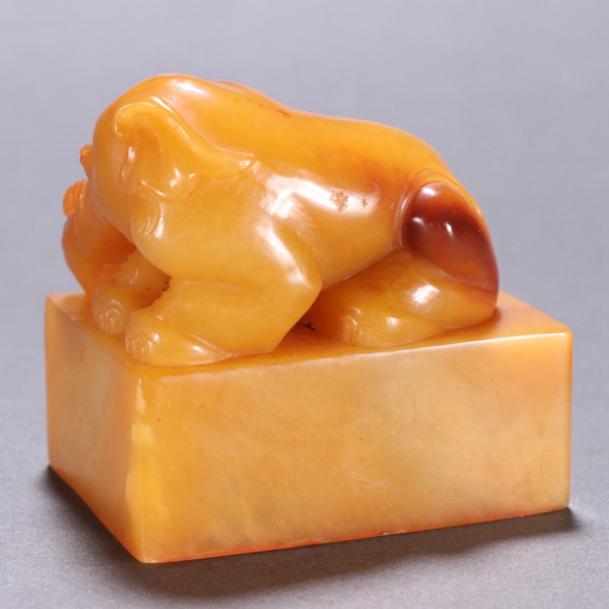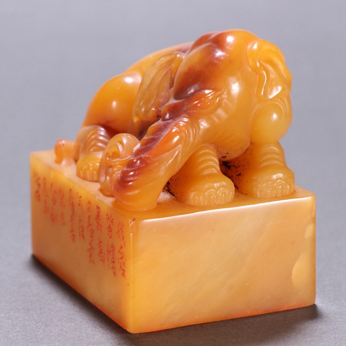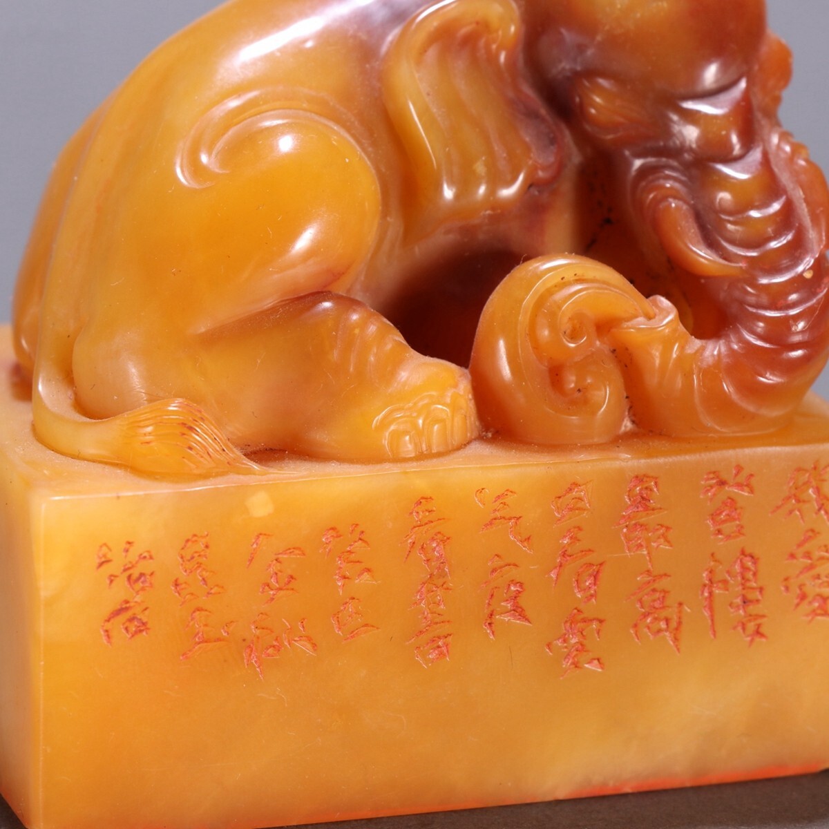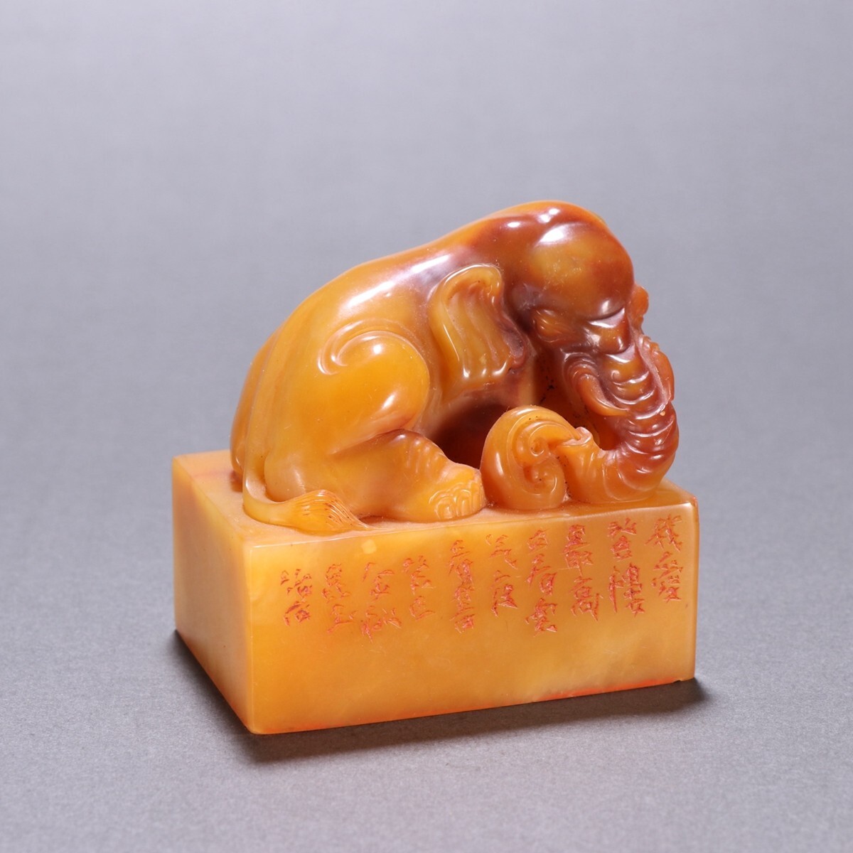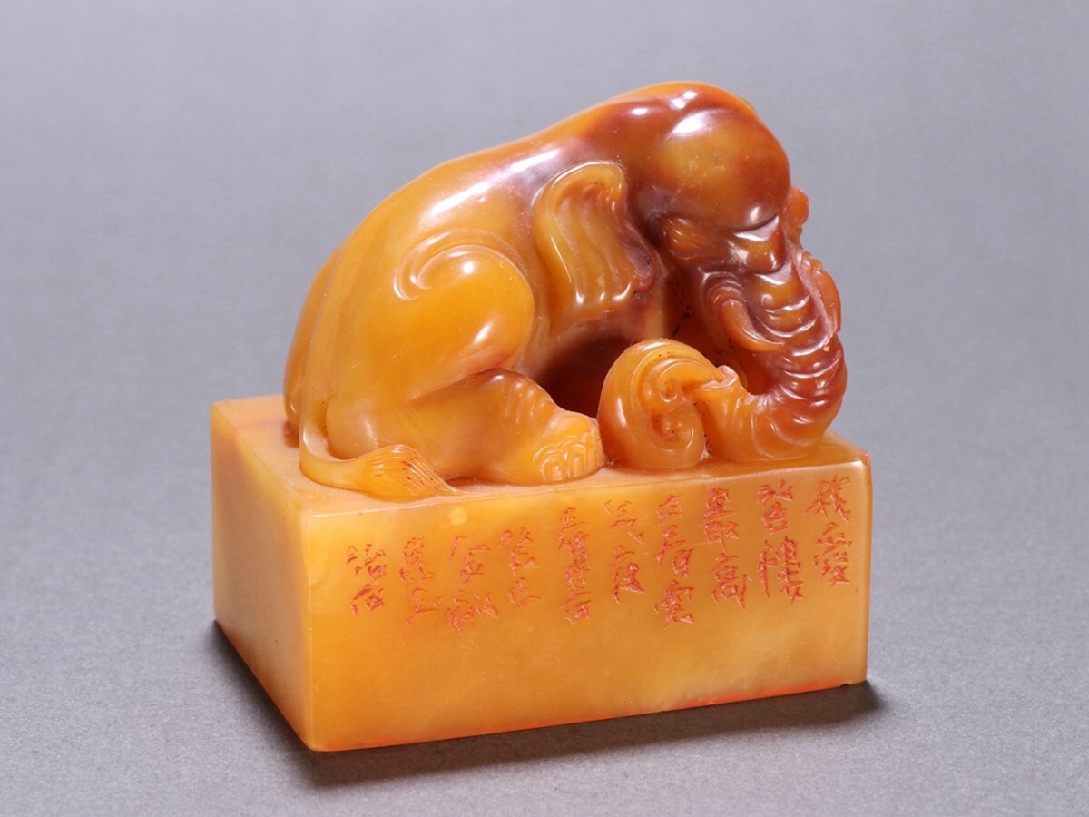 清代 昆玉作 老寿山石 田黄石彫 象鈕印章【仁】極細工 手彫り 中国古賞物 古美術 蔵出