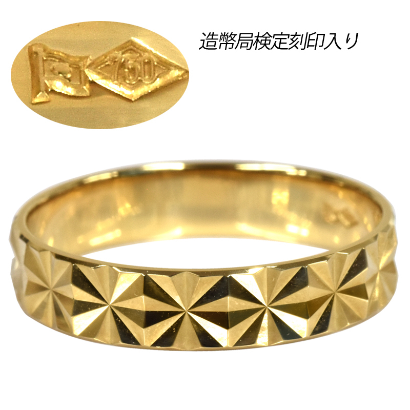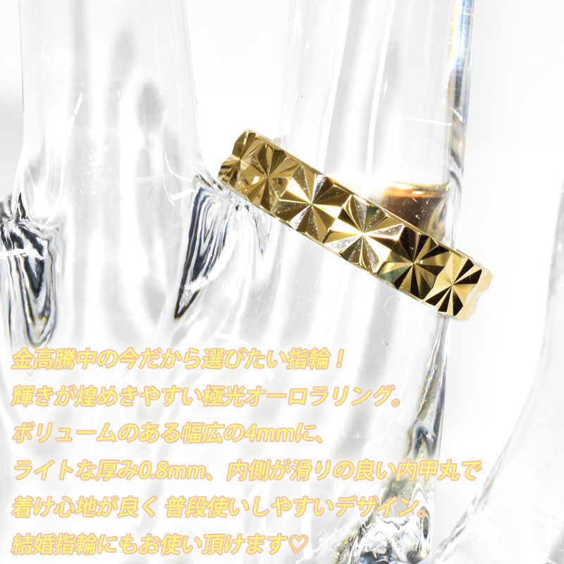 コメント | 輝きが煌めく18金ゴールドリング。 見栄えのする4mm幅リングで、日常使いにガンガン使えるデザインリングです。 極光カットでダイヤモンドが無くても、輝いて綺麗です! また内甲丸になっているので、着け心地も抜群! カット面が両横の指に当たっても痛くないように、厚みは控えめです。 |