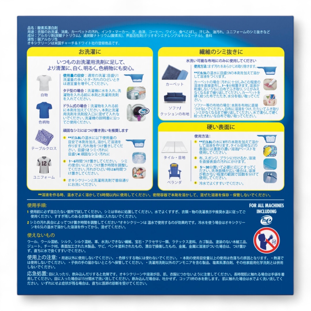 衣類、布製品、台所まわり、水まわり、家具など、様々な家中の汚れに役立ちます。