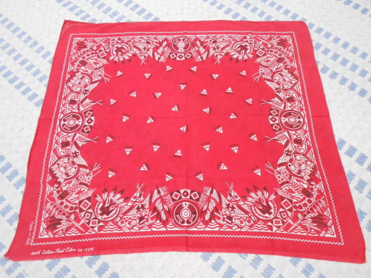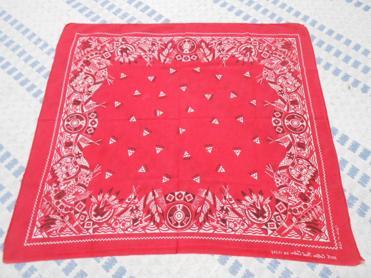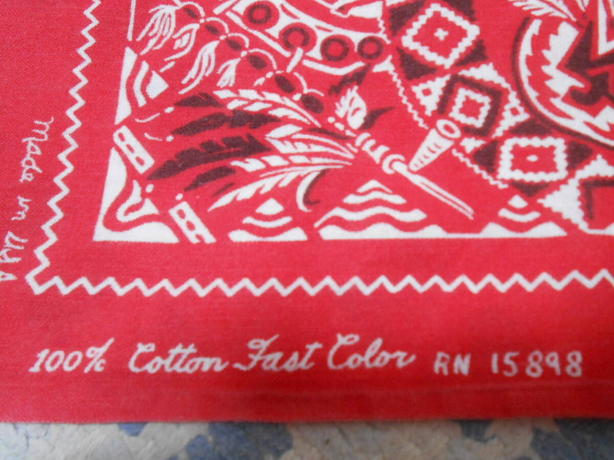 ビンテージ USA製 バンダナ レッド 赤 筆記体 インディアン 100% COTTON FAST COLOR RN15898 アメリカ製 定形外発送可能