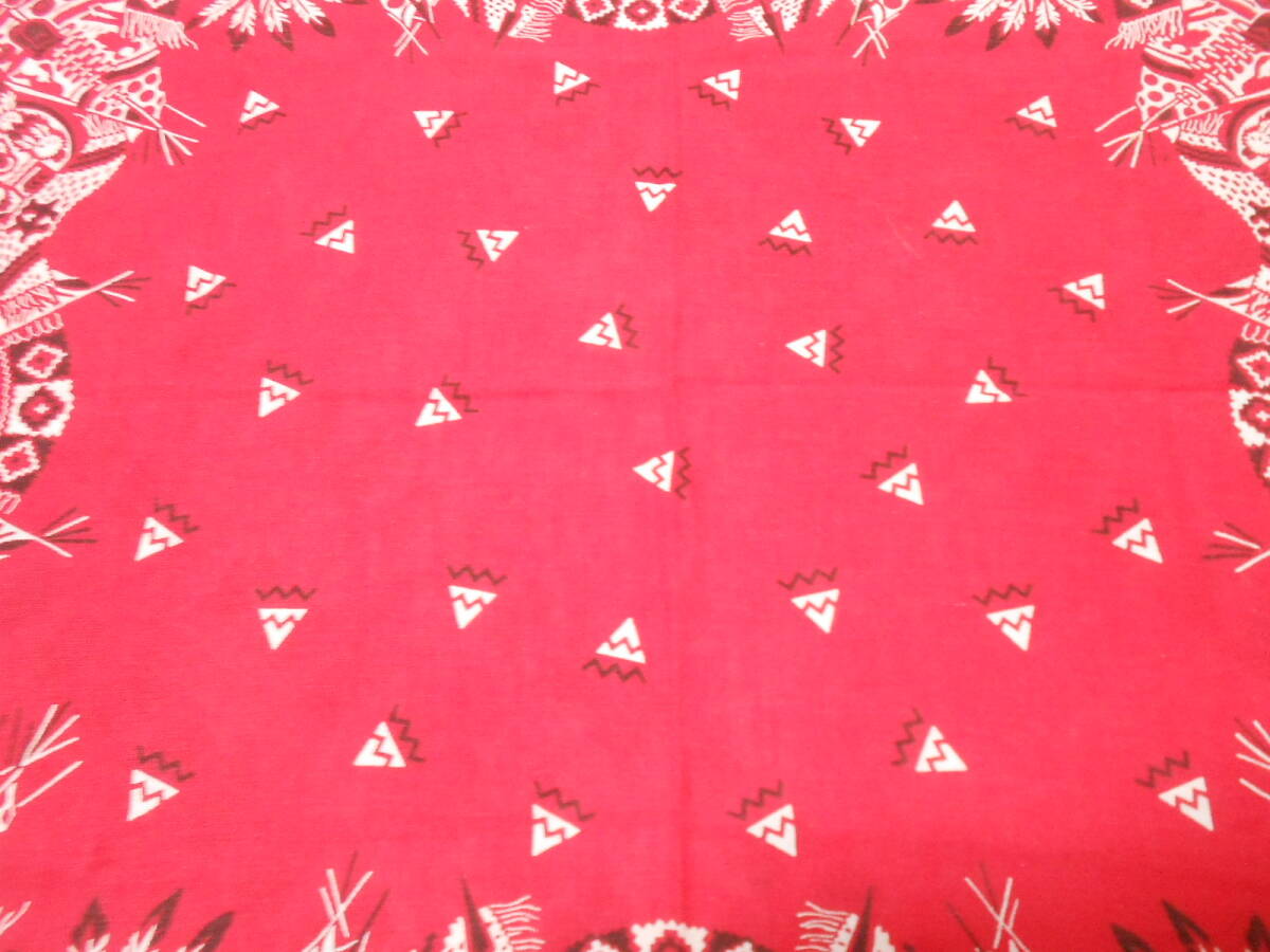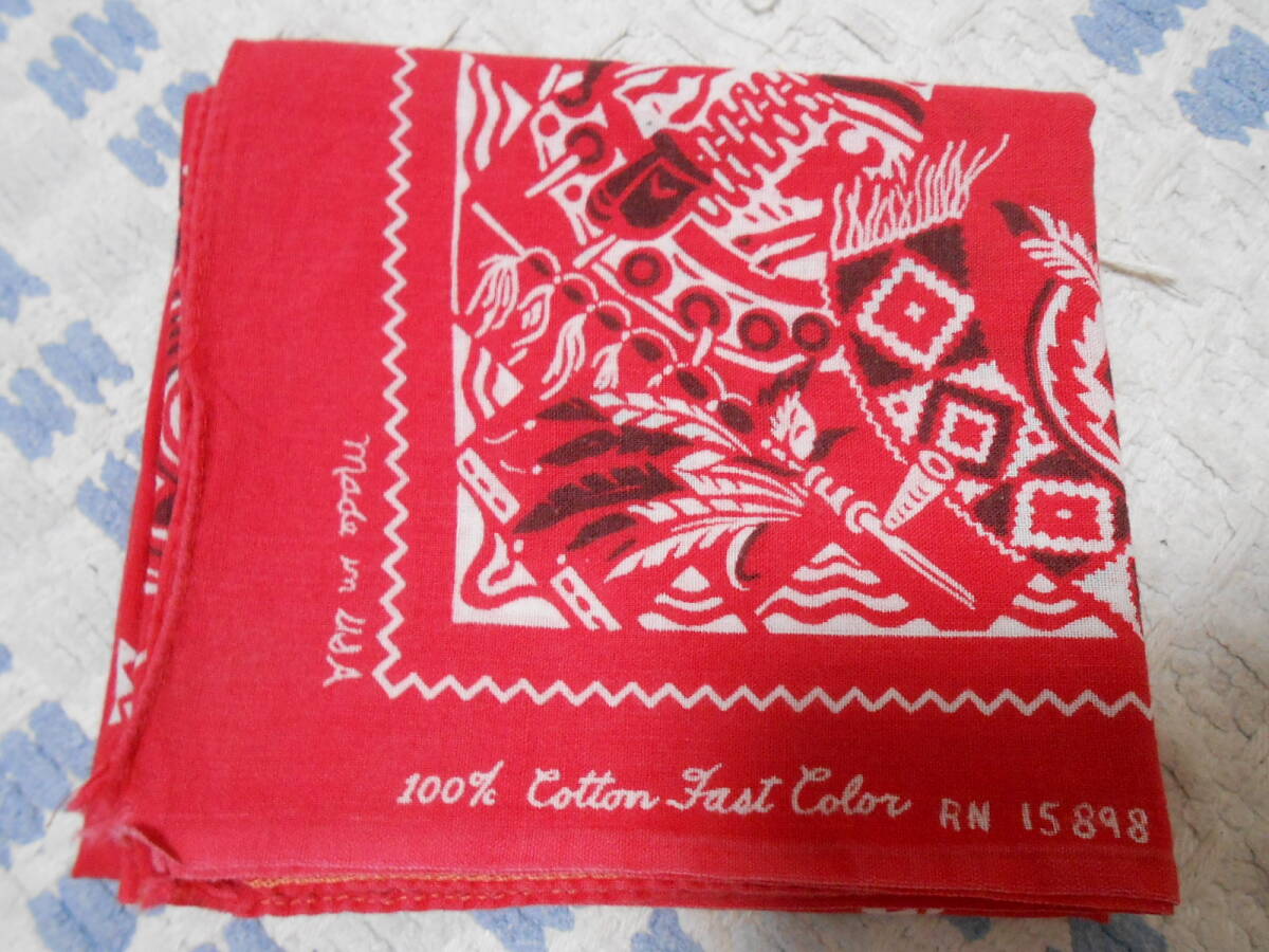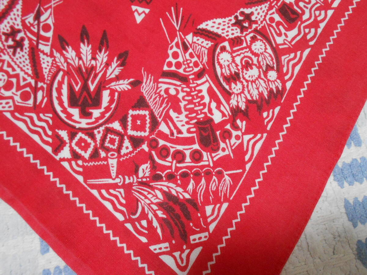 ビンテージ USA製 バンダナ レッド 赤 筆記体 インディアン 100% COTTON FAST COLOR RN15898 アメリカ製 定形外発送可能