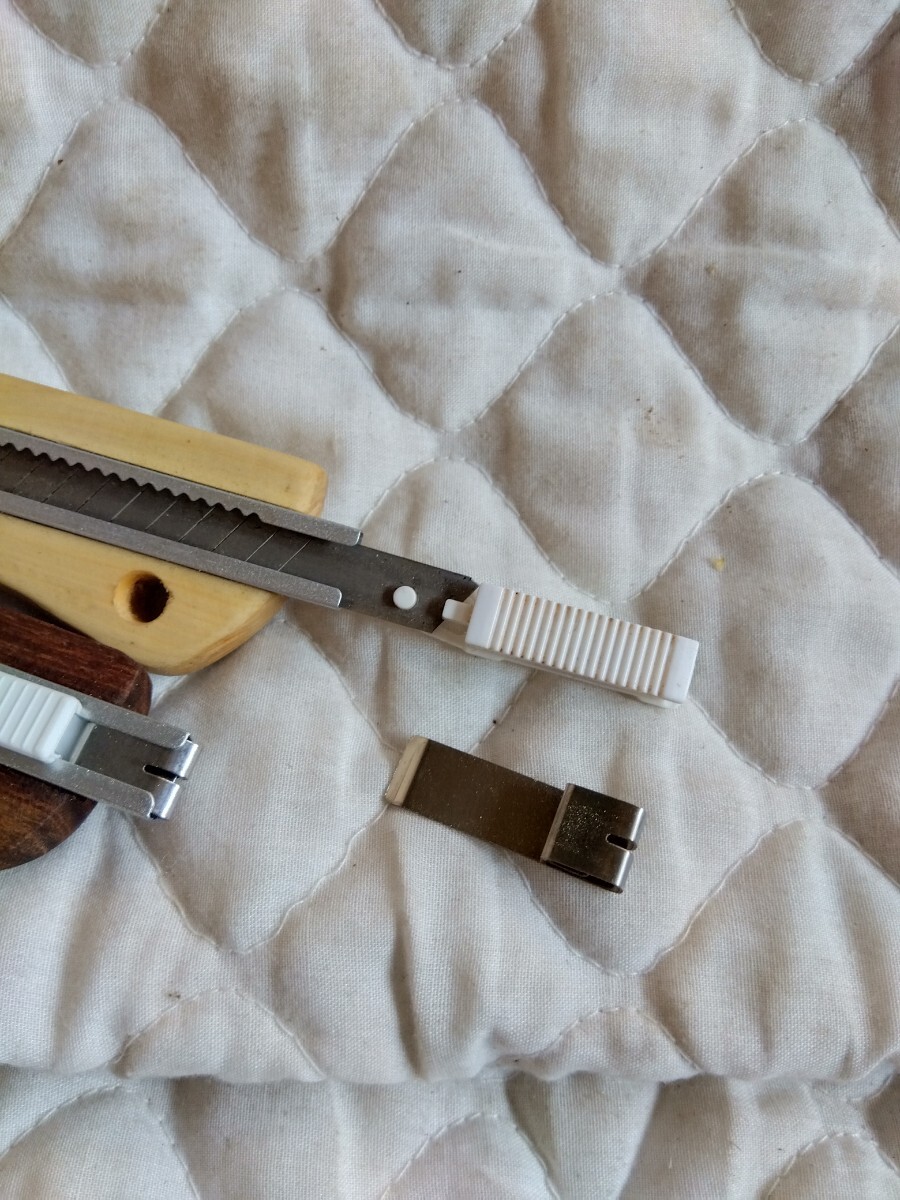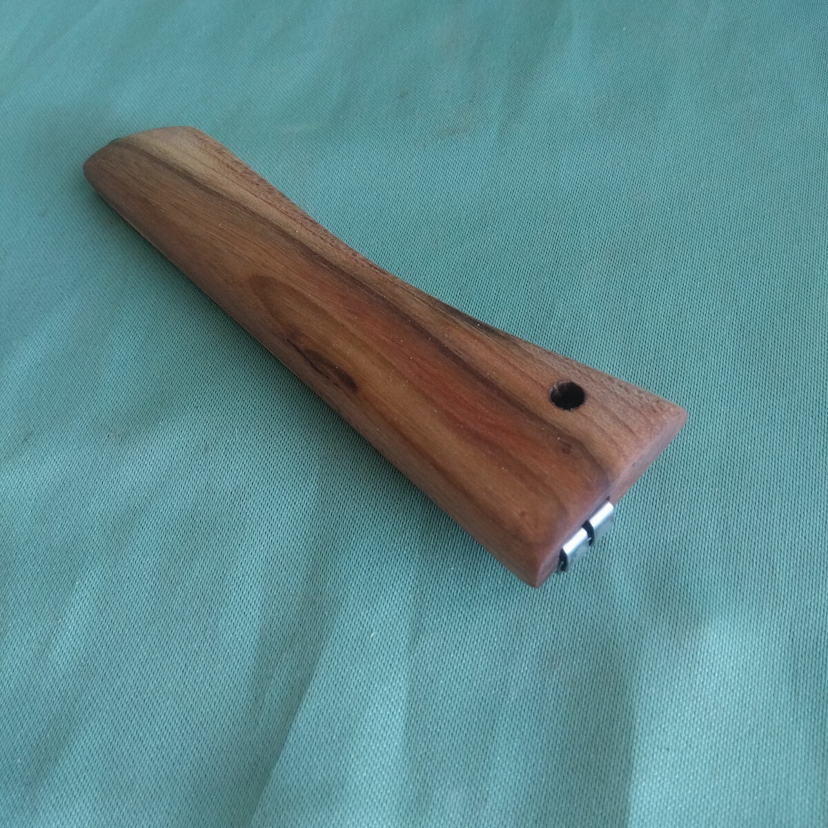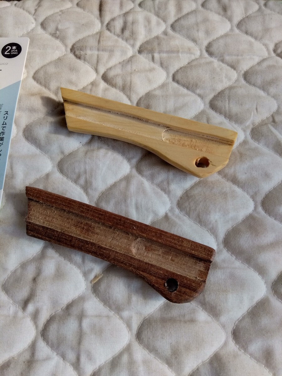100均のカッターナイフに手造り木工品でケース合体した品物です。楢(ナラ、なら)の1本に成ります。カッターナイフ本体は接着して有り、替刃交換は画像5枚目の様に金具をスライスすれば簡単に交換出来ます。画像6枚目、7枚目は組み立て前に成ります。ハンドメイドマーケットで手造り品好きな方に良く売れてる品物です。最近は木工オイルで仕上げて有るので、滑らかで、持った感じも良いと好評です。現物を手に取って確認してもらいたですが、画像からご理解、ご納得いただける方にお願いします。手造りですから、完璧では有りませんから、慎重にご検討下さい。また、追加で2本組や割と左手仕様の方もフリーマーケットで頼まれるので、左手用も出品し始めたので、1本のみのご購入や複数、同梱も送料同じで発送出来ますから、様子でご検討いただけたら、おまとめ対応します。発送はゆうパケットに成ります。尚、土、日、祝日はフリーマーケットやハンドメイドマーケット出店の場合、翌日の発送に成りますが、即決価格ですから、タイミングみて、ご購入いただければ、スムーズな発送出来ます。宜しくお願いします。ありがとうございます。