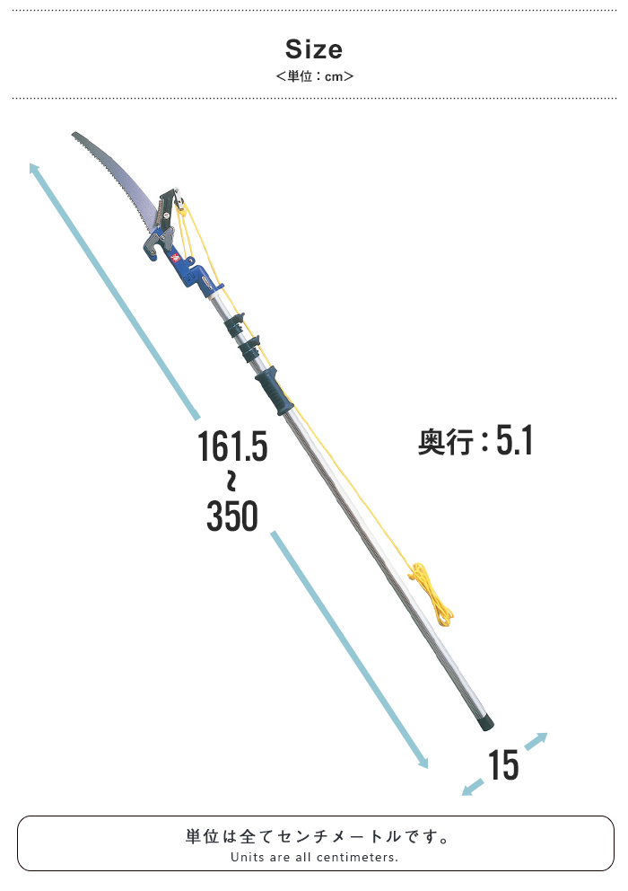 ・ 伸縮機能:1.6~3.5m(無段階式) ・ 首振りヘッド:80° ・ 最大切断径:約Φ2.5cm(生木)(※木の種類や季節により異なります。) ・ キャッチ機能 ・ 取付専用ノコギリ付き ・ 疲労軽減:肩掛けベルト ・ 本刃加工:フッ素樹脂 ・ 軽量設計 |