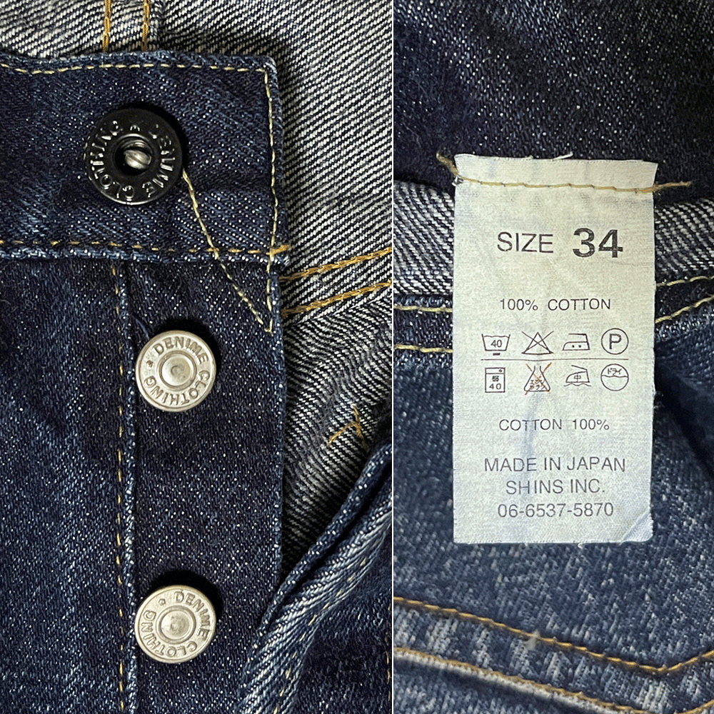 日本製、素材は綿100%、フロントはボタンフライ、トップボタンは黒ラッカーのドーナツボタン、紙パッチ仕様、XXタイプのように太めのストレートシルエットです。