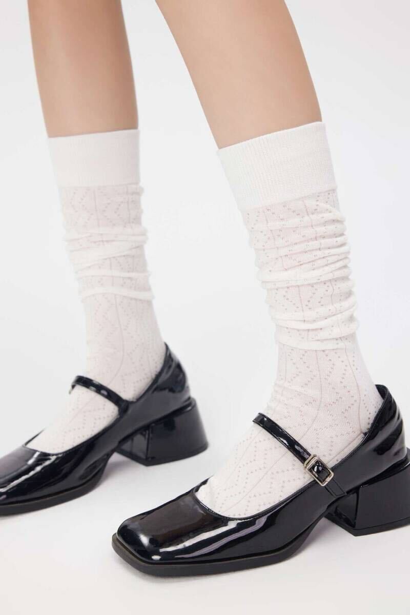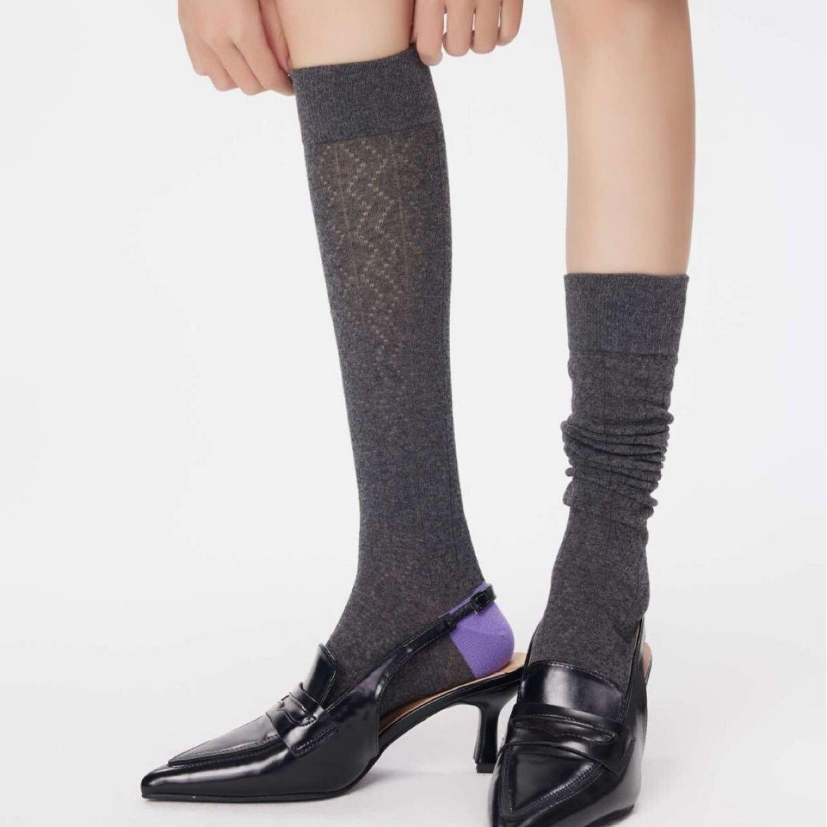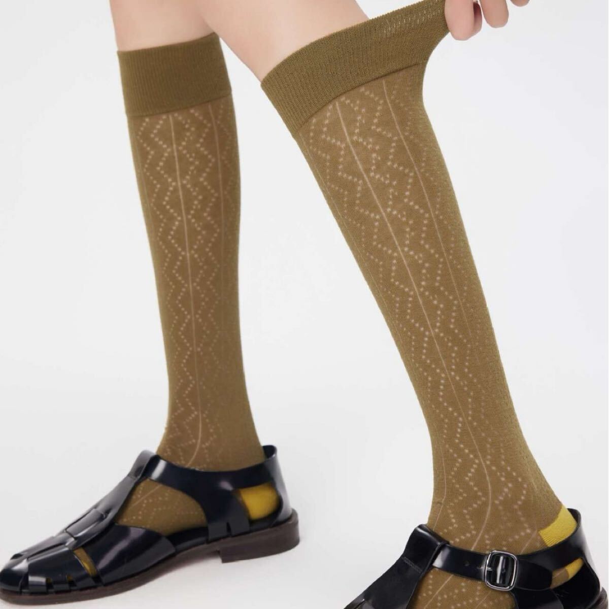 大人っぽくさりげない柄に程よい透け感が上品なハイソックスです。