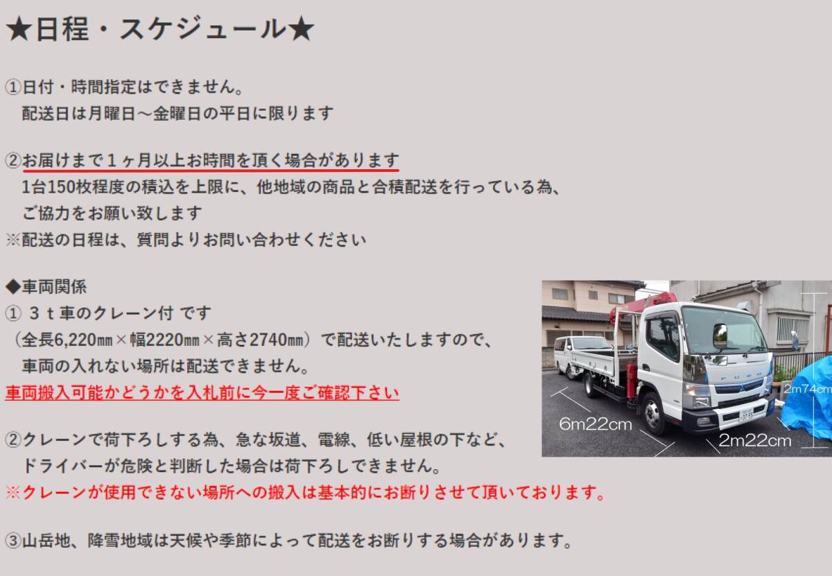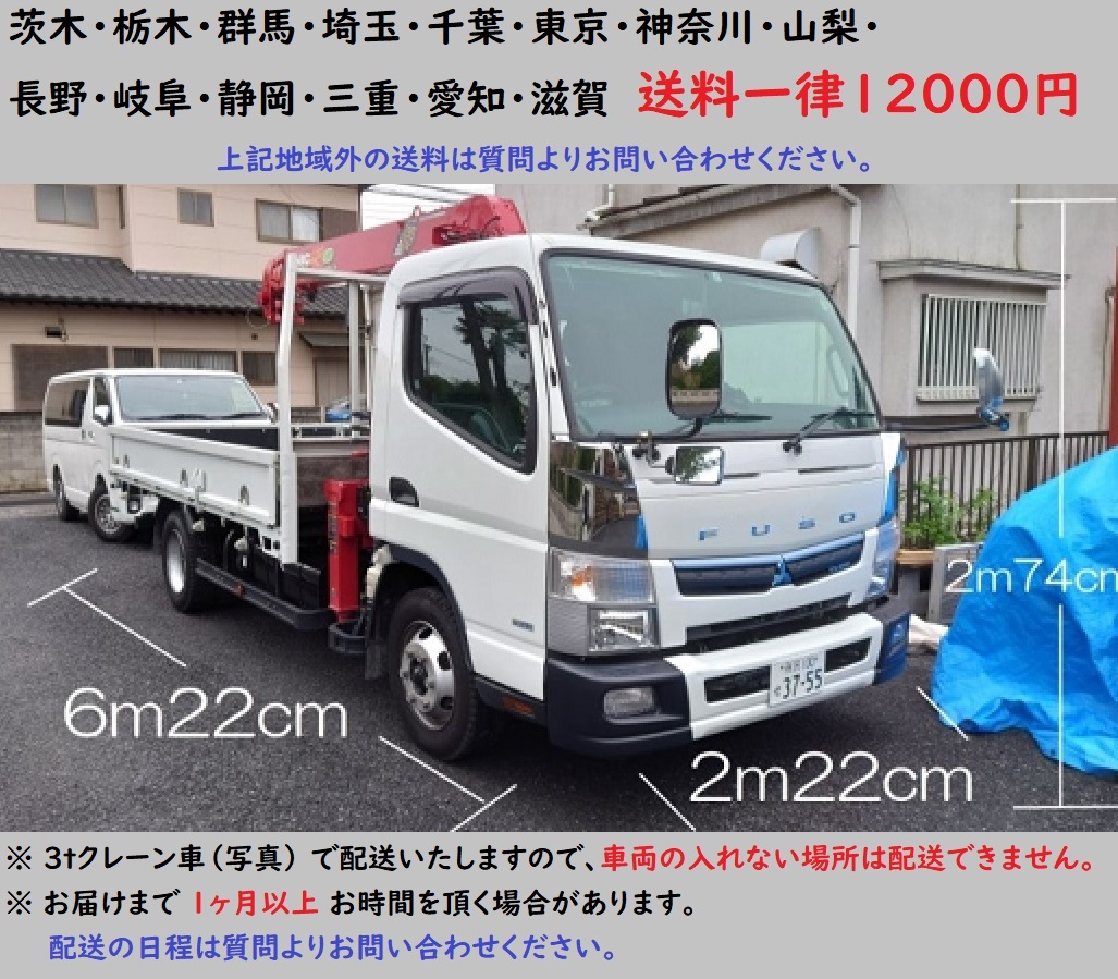 | 商品 引き渡し | ① 茨木・栃木・群馬・埼玉・千葉・ 東京・神奈川・山梨・長野・岐阜・静岡・三重・愛知・滋賀 送料一律12000円 ↓ 配送条件があります。必ずお読みください。↓ ★日程・スケジュール★ ①日付・時間指定はできません。 配送日は月曜日~金曜日の平日に限ります。 ②お届けまで1ヶ月以上お時間を頂く場合があります。 合積配送を行っている為ご理解、ご協力をお願い致します。※配送の日程は質問よりお問い合わせください。 ★車両関係★ ① 3t車のクレーン付 で配送いたしますので、 車両の入れない場所は配送できません。 (全長6,220㎜×幅2220㎜×高さ2740㎜) ②クレーンで荷下ろしする為、急な坂道、電線、低い屋根の下など、ドライバーが危険と判断した場合は荷下ろしできません。 ※クレーンが使用できない場所への搬入は基本的にお断りさせて頂いております。 ③山岳地、降雪地域は天候や季節によって配送をお断りする場合があります。 ②上記地域外有料配送 送料は「出品者への質問」からお問い合わせください。 配送条件があります(上記、画像を参照ください) ③ 当社倉庫引取り 【お引取り場所】 〒350-2213 埼玉県鶴ヶ島市脚折1596-1 【引取可能時間】 (月)~(金) 9:00~16:00 ※土日祝 休 ※冬季・夏季休業、GW等の長期休業は倉庫引取も休業となります。 ※商品を手前に出しておくなど準備時間が必要です。 事前に日時をご相談の上ご来社ください。 ※軽トラック、乗用車の積込はお勧めしません。 ※構内が狭い為、4t以上の車両はお受けできません |