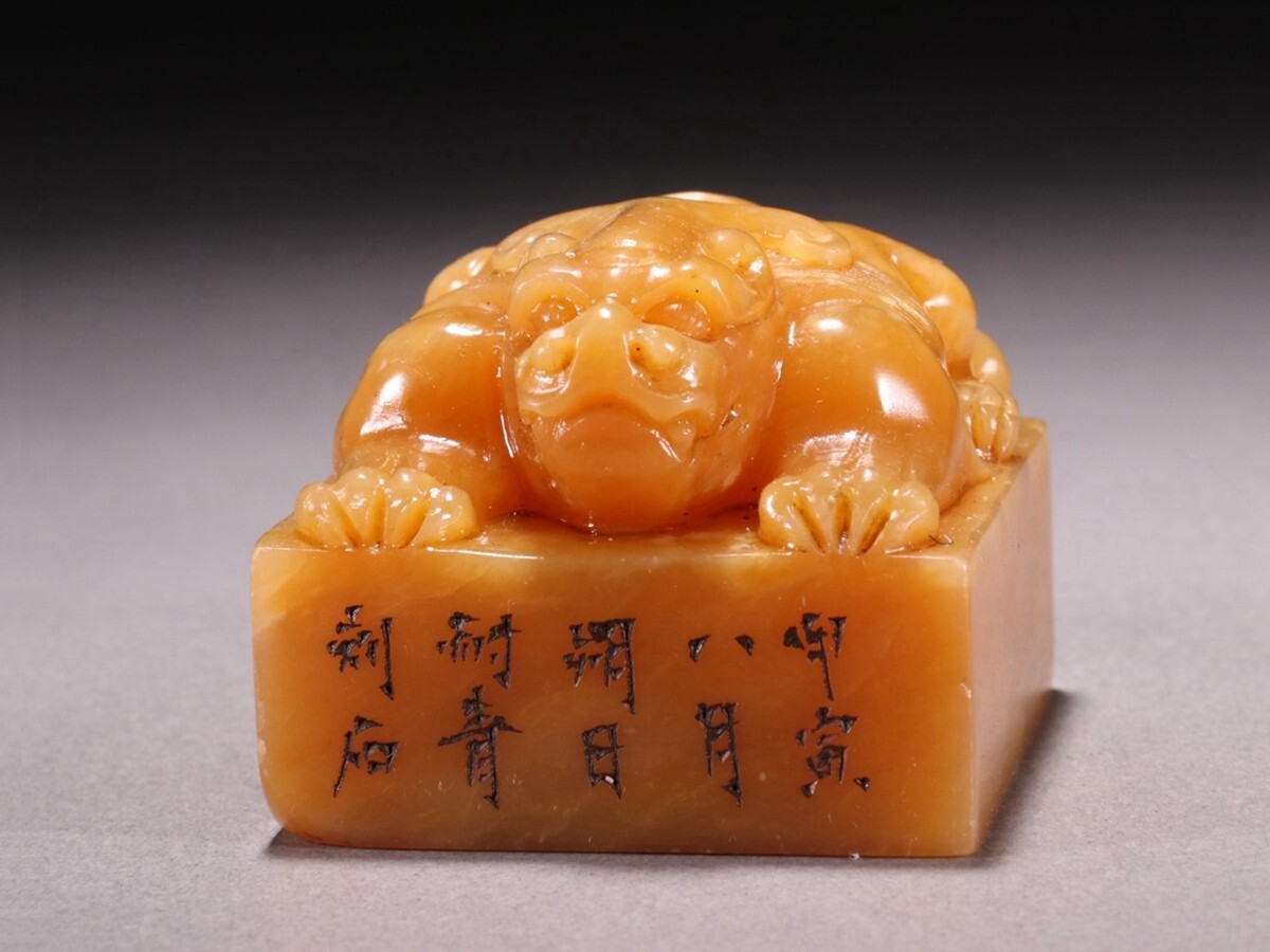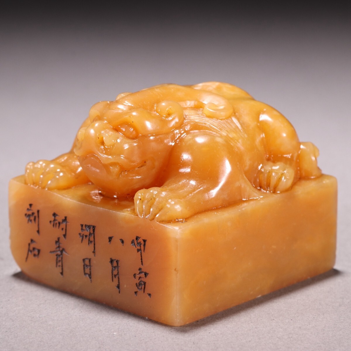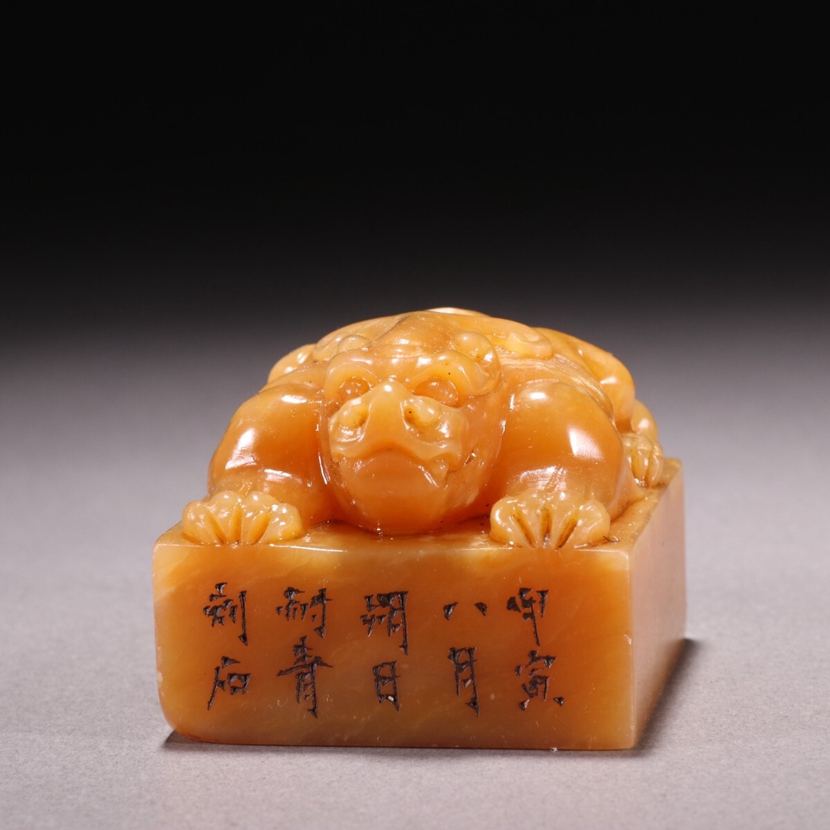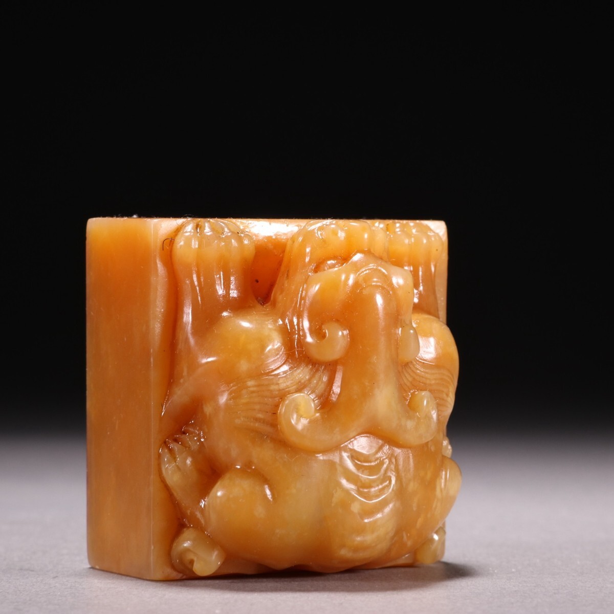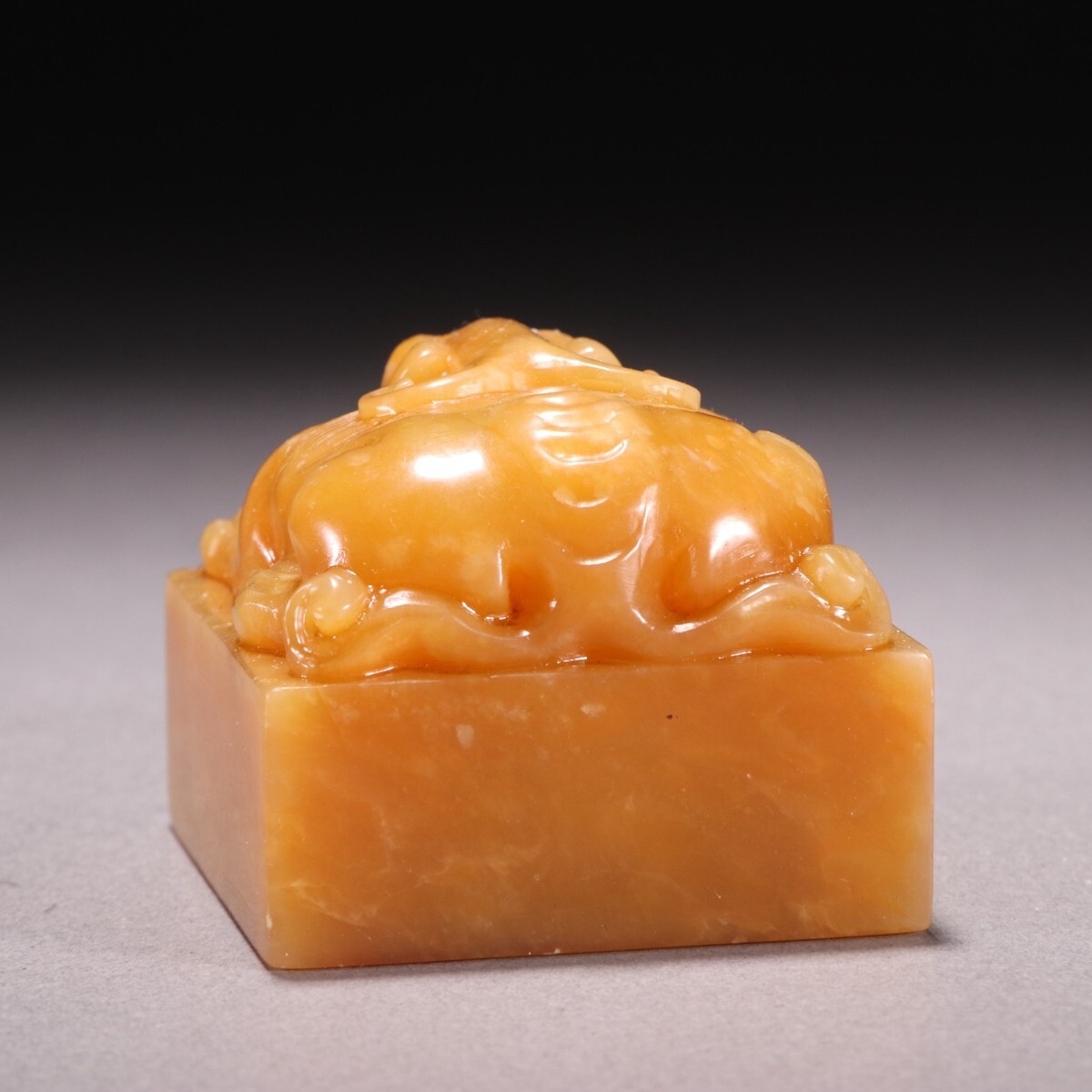 「清 耐青作 老寿山石 田黄石彫り 盤龍鈕印章」極細工 擺件 古賞物 中国古美術 旧蔵出