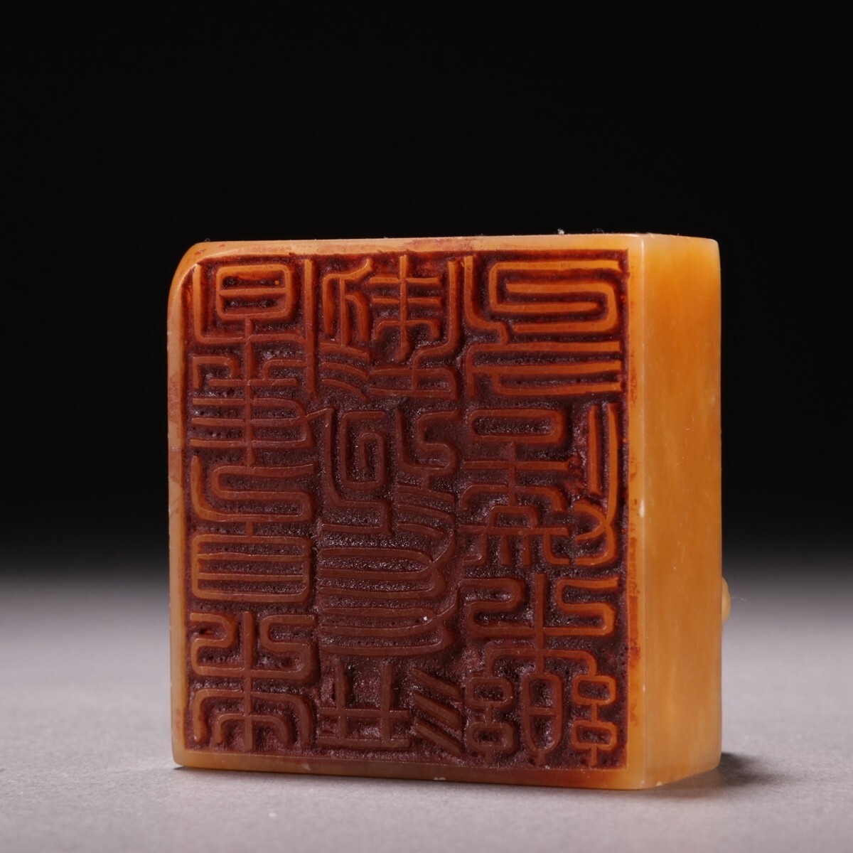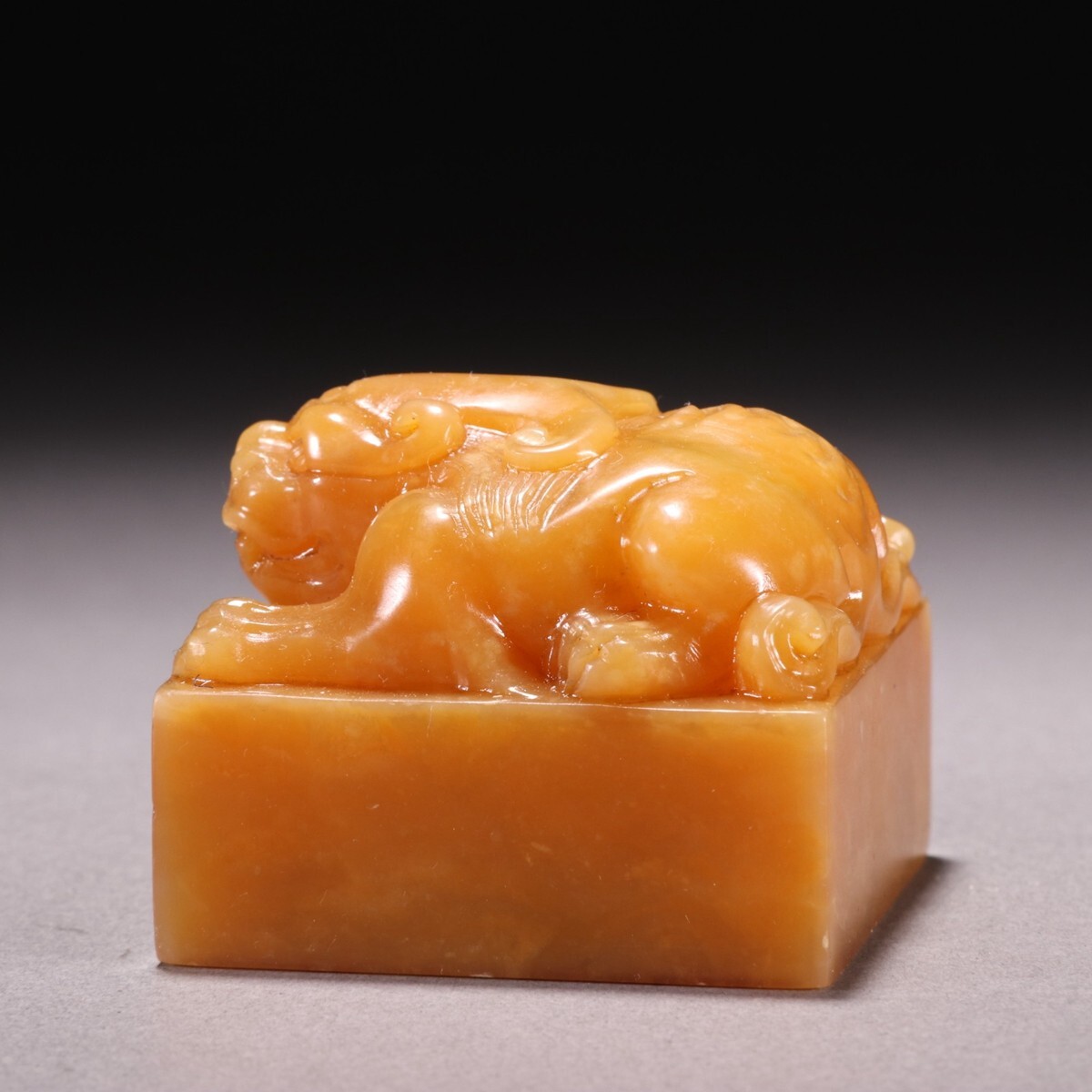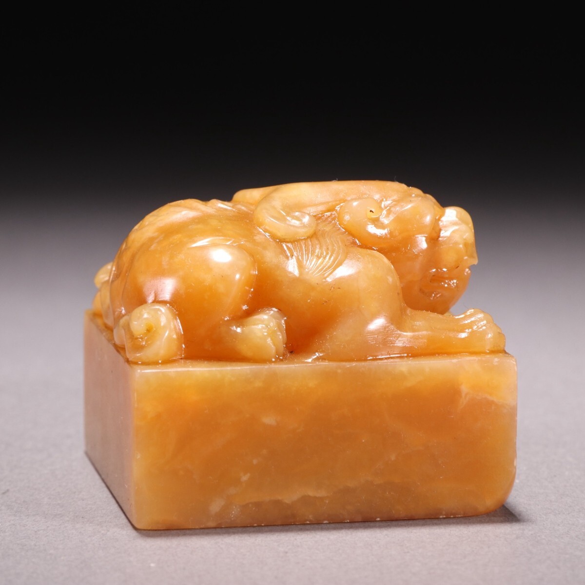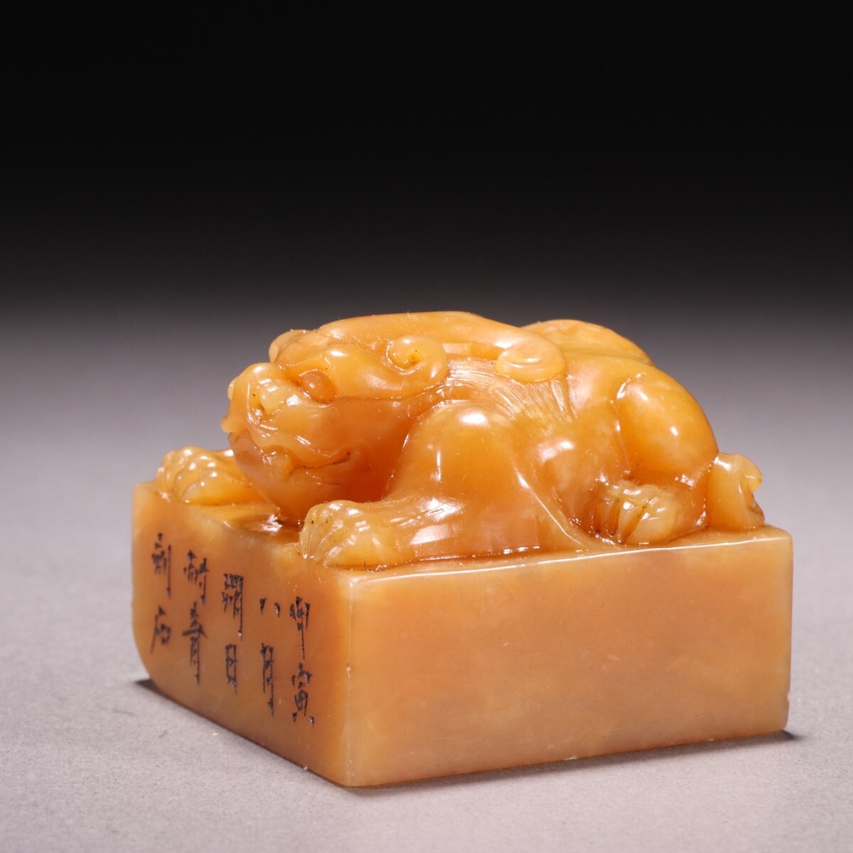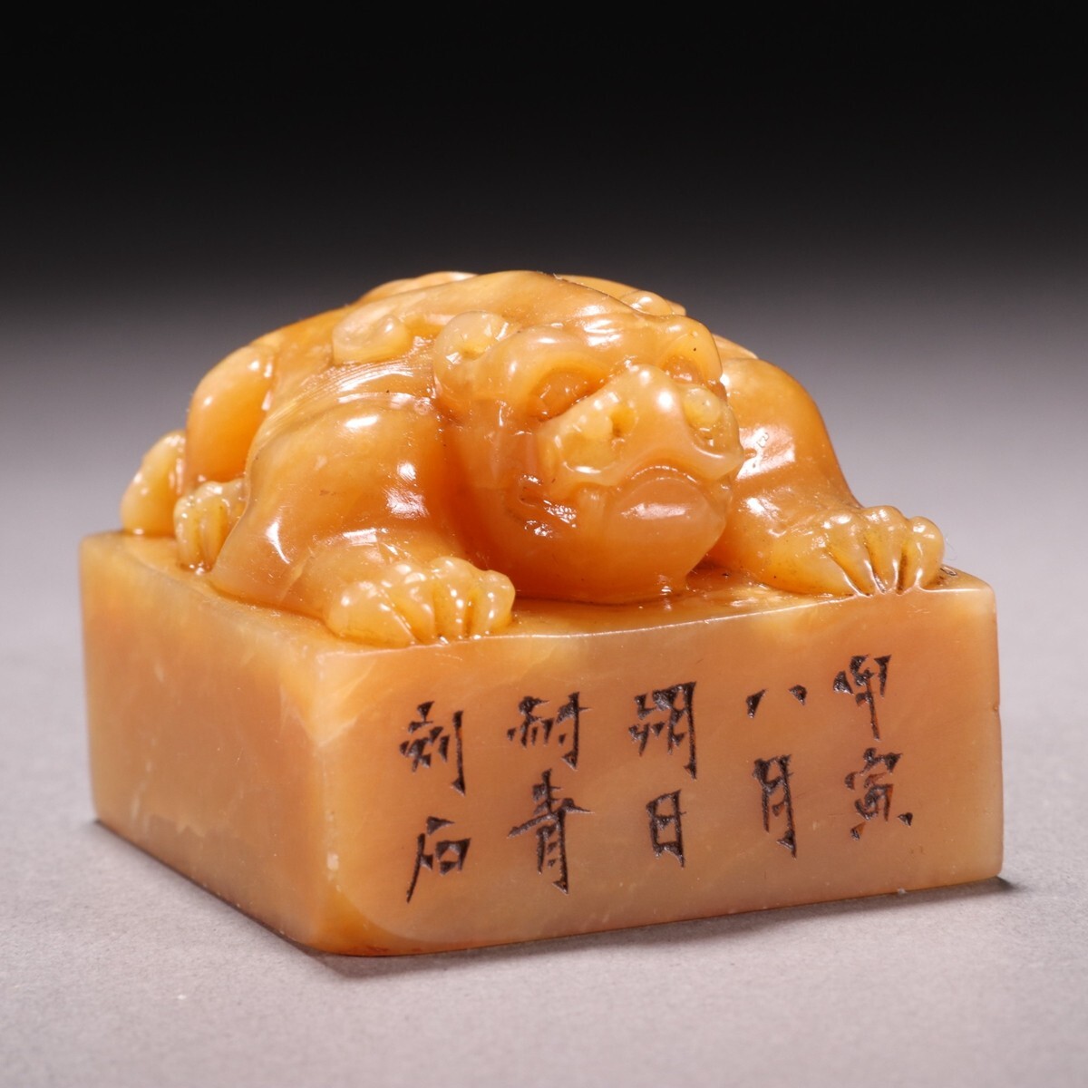 「清 耐青作 老寿山石 田黄石彫り 盤龍鈕印章」極細工 擺件 古賞物 中国古美術 旧蔵出