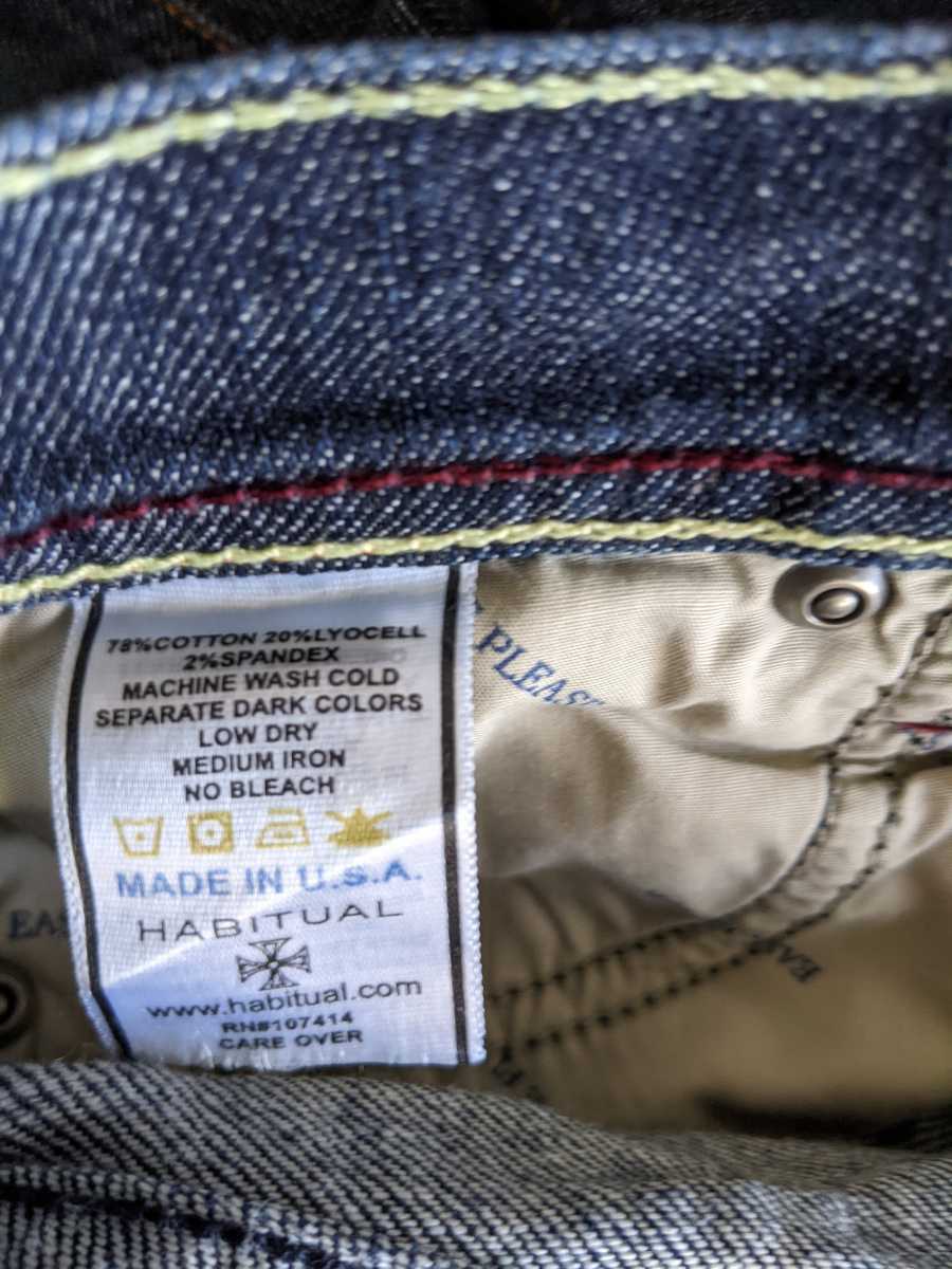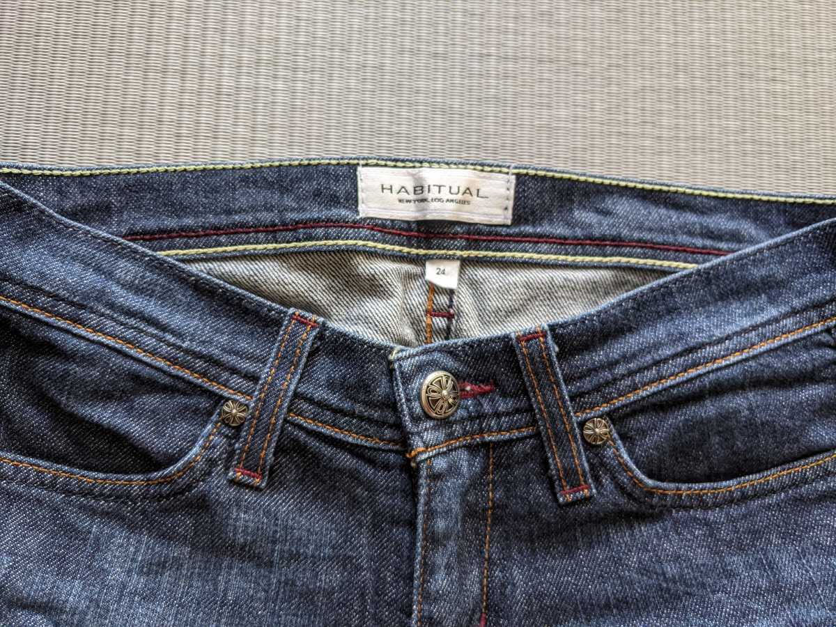 ⇒平置きで、ウエスト34.5cm、股上17cm、股下87cm、裾幅14.5cm