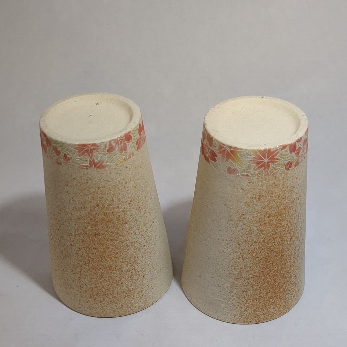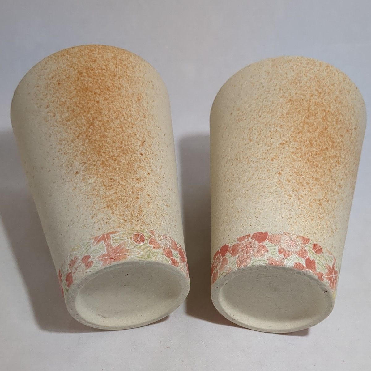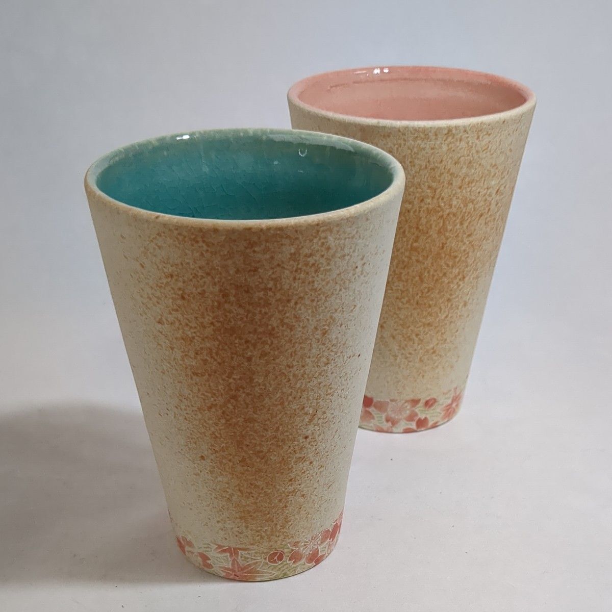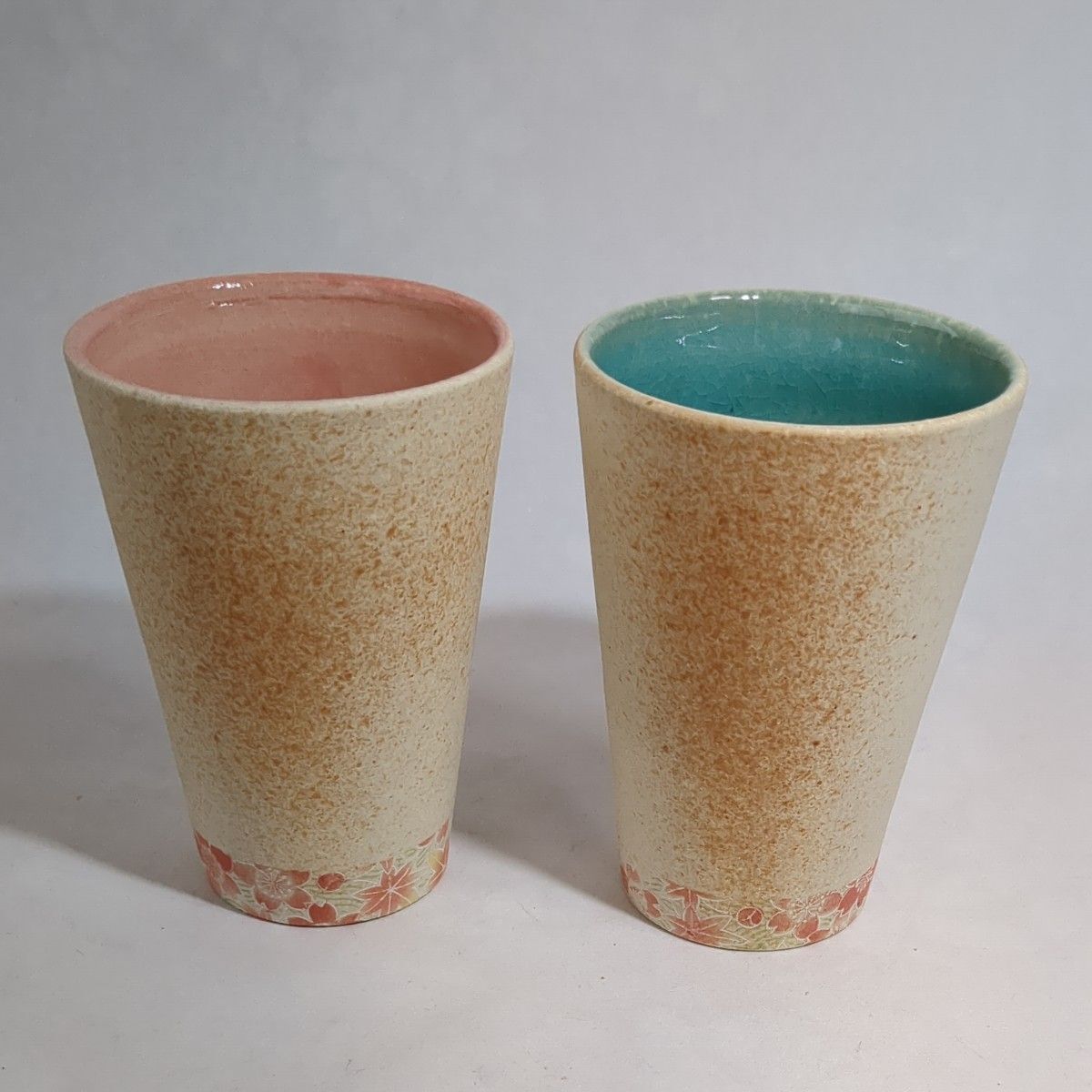 和食器のペアタンブラーです。外側は素焼きのベージュ系の生地にピンクベージュ系の釉薬を細かく吹き付けています。内側はピンクと水色の艶のある釉薬で色付けされています。底部には桜の花と紅葉の絵柄で和の雰囲気を醸し出しています。窯元、産地は不明ですが、ギフト品のようできちんとしたお造りです。口部に向かい広がっていますのでスタッキング可能です。ビールグラスとして、焼酎のお湯割りにと、酒器として映えそうなデザインです。