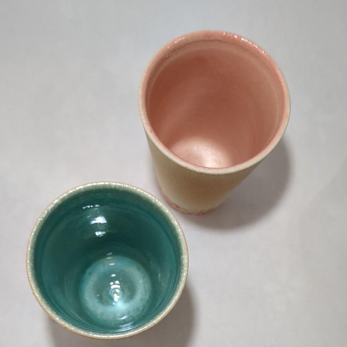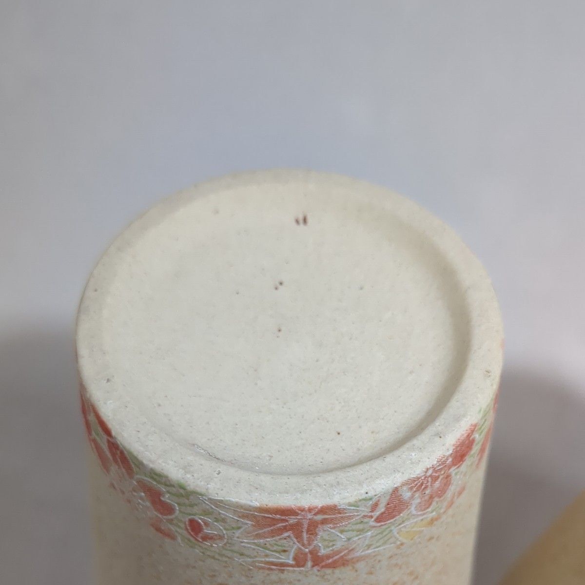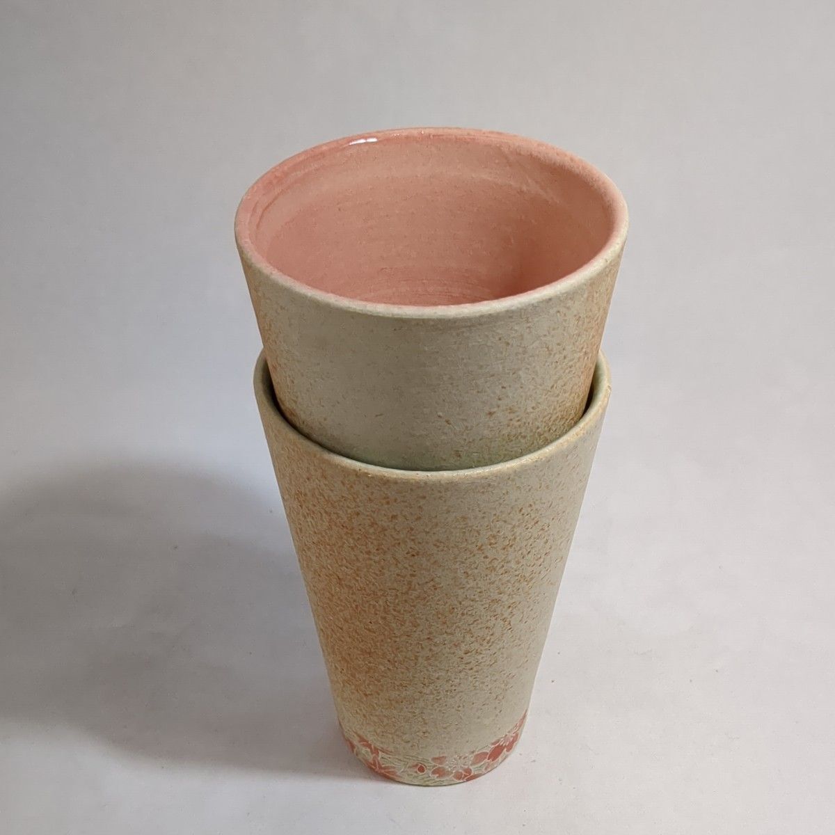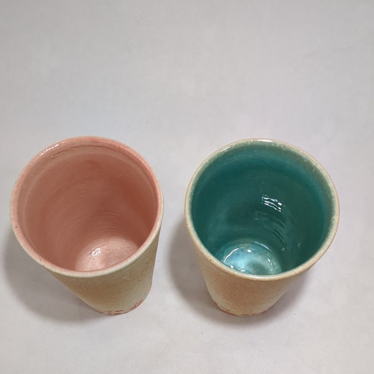 和食器のペアタンブラーです。外側は素焼きのベージュ系の生地にピンクベージュ系の釉薬を細かく吹き付けています。内側はピンクと水色の艶のある釉薬で色付けされています。底部には桜の花と紅葉の絵柄で和の雰囲気を醸し出しています。窯元、産地は不明ですが、ギフト品のようできちんとしたお造りです。口部に向かい広がっていますのでスタッキング可能です。ビールグラスとして、焼酎のお湯割りにと、酒器として映えそうなデザインです。