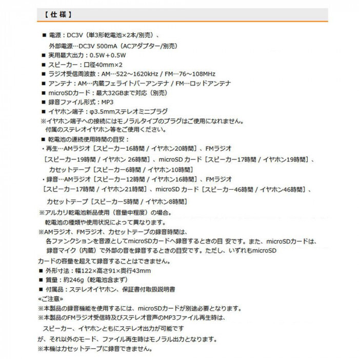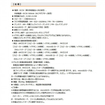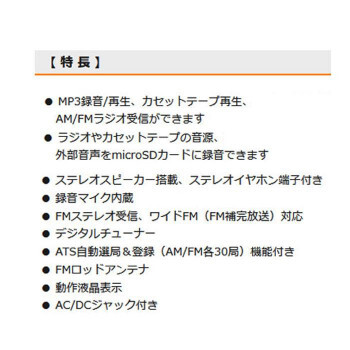 | MP3録音/再生、カセットテープ再生、AM/FMラジオ受信ができます。ラジオやカセットテープの音源、外部音声をmicroSDカードに録音できます。ステレオスピーカー搭載、ステレオイヤホン端子付きです。 |