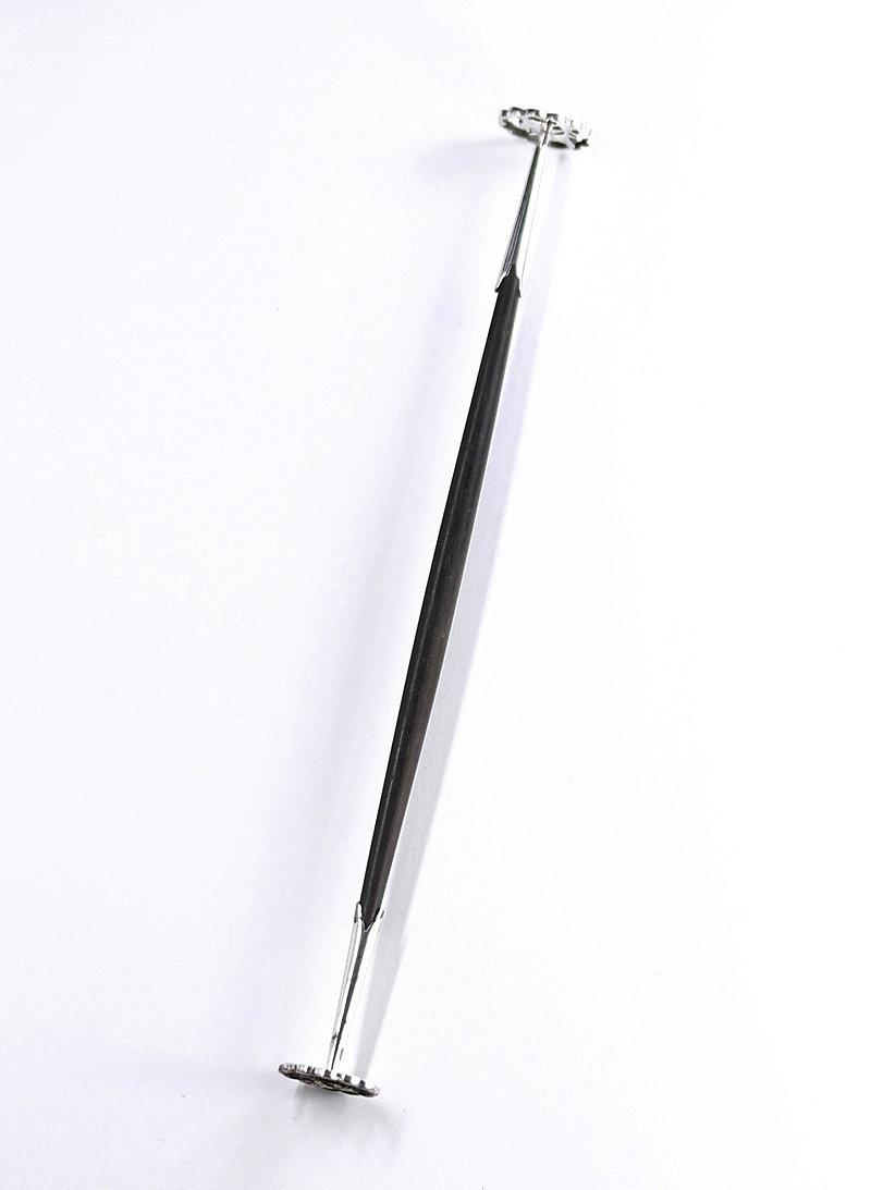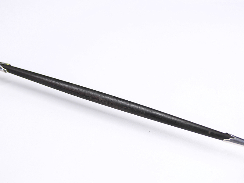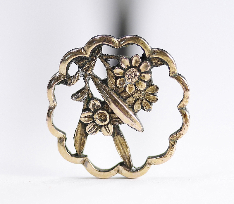 木製芯の両端装飾に銅地の金工飾りがほどこされた御品物です。裏は白銅、意匠の彫金部は鍍金を被せているようで金銀の彩りがはっきりとしております。 大胆に透かした意匠は水仙と菊か小振りで美しくデザインされています良い御品です。