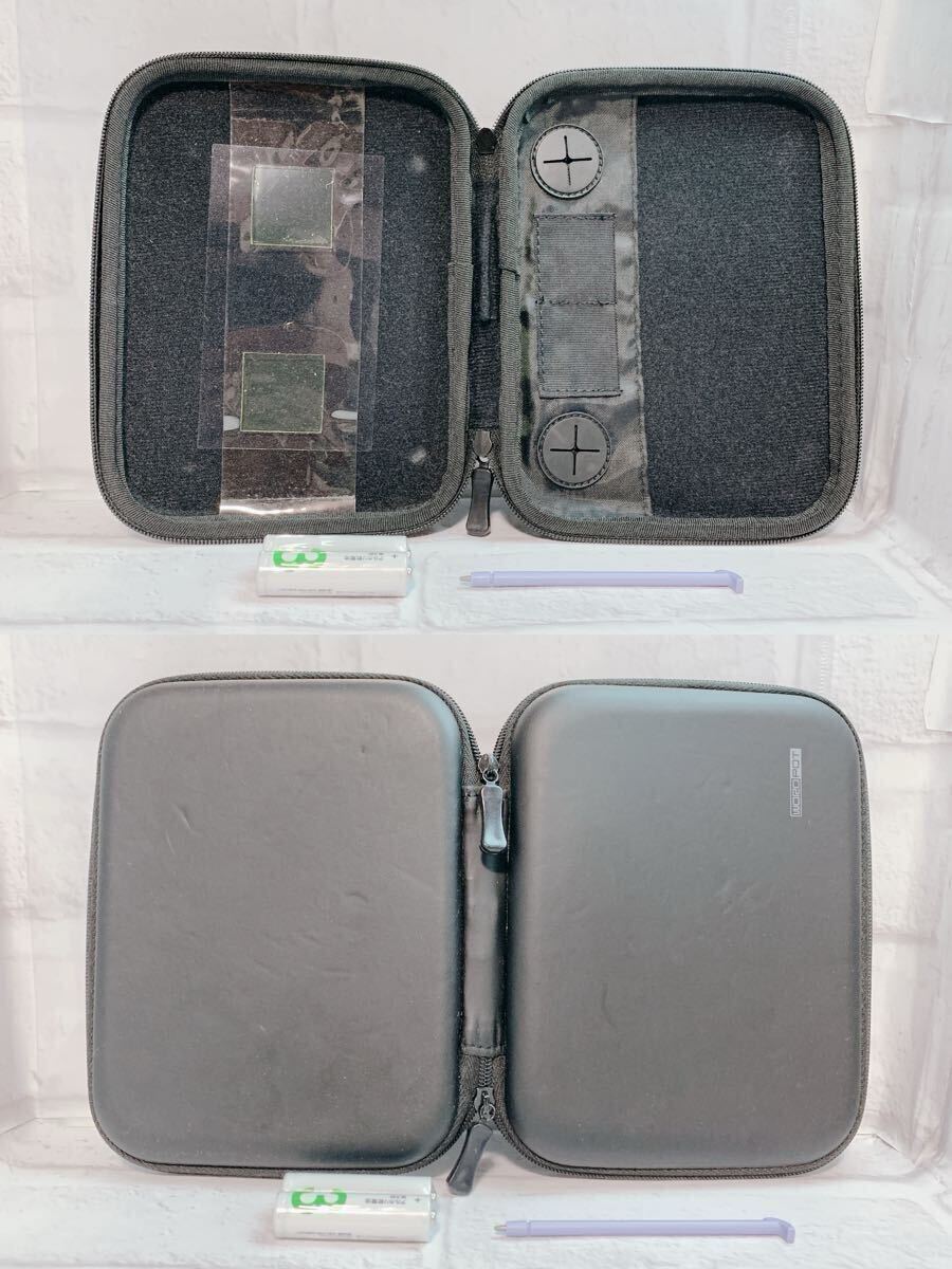 ケース(中古・黒・セミハードタイプ)は、外側表裏面ともに全体的にへこみやスレ跡が多少見受けられます。内側は目立った汚れや傷はなく、キレイな印象です。滑り止めマットも付いています。