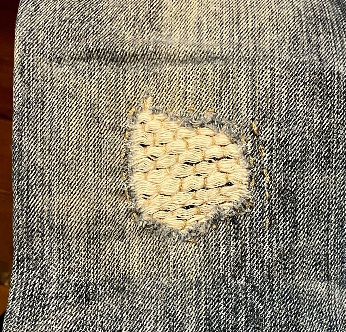 驚くべきは右膝部分にあり、ダメージの上に編み込み状にリペアを手作業で施しています。