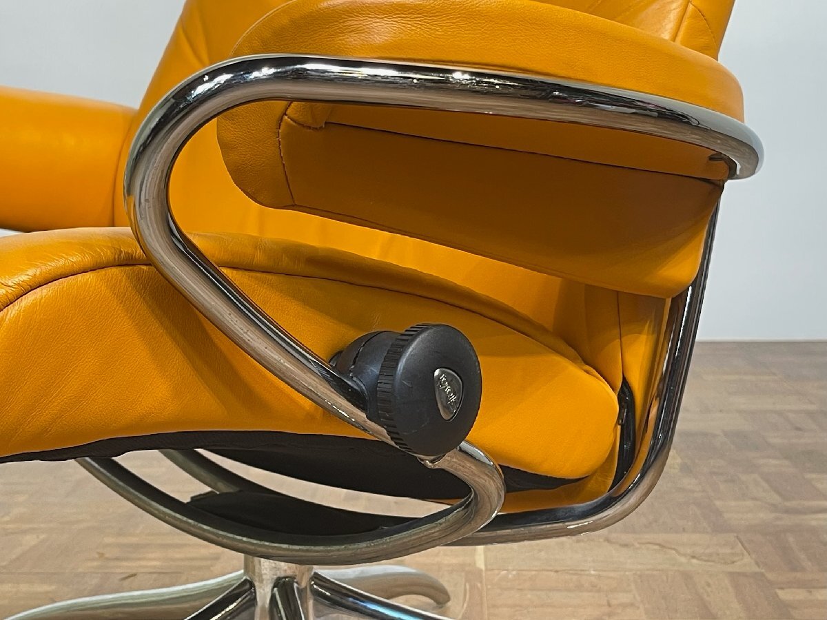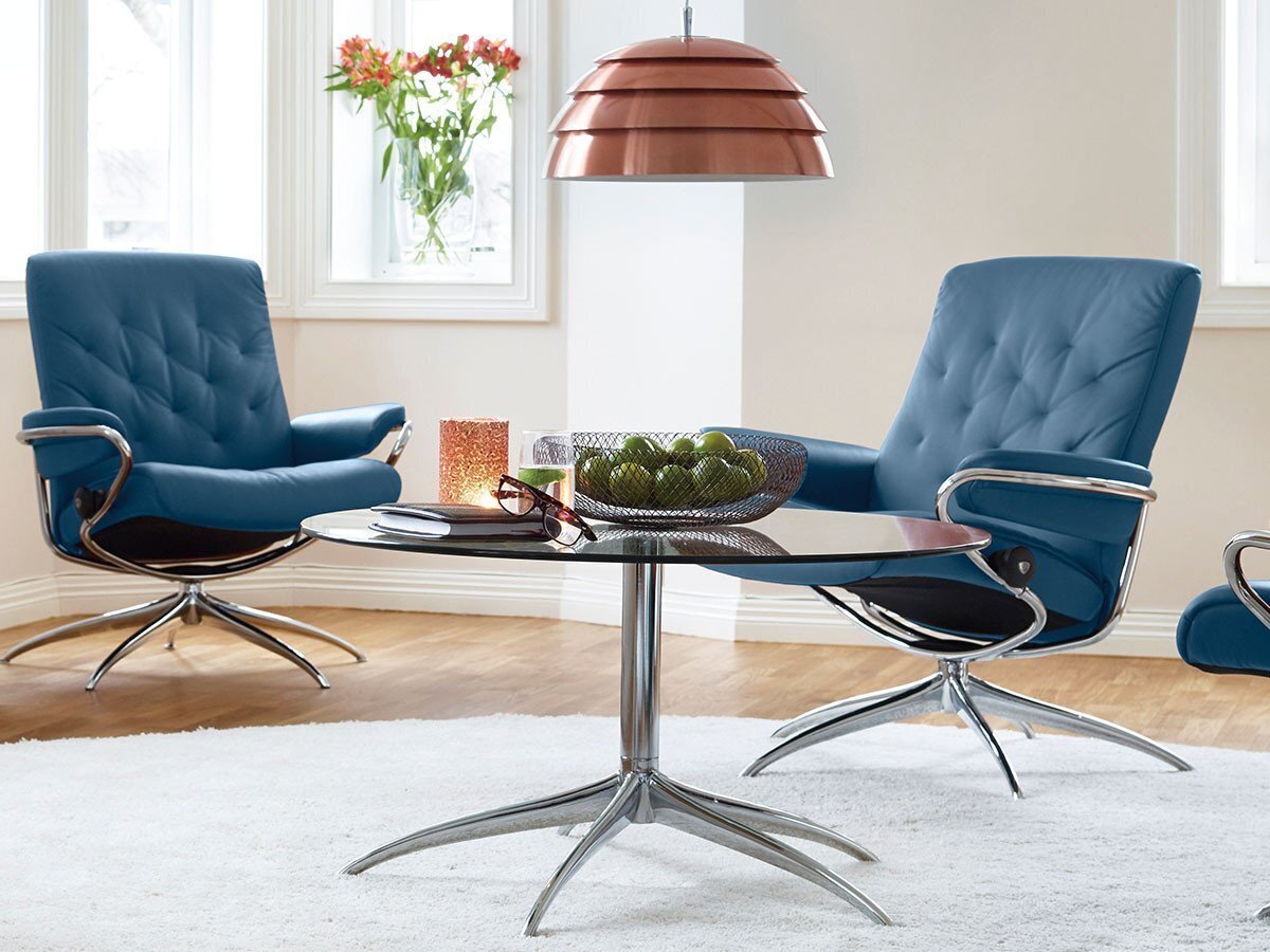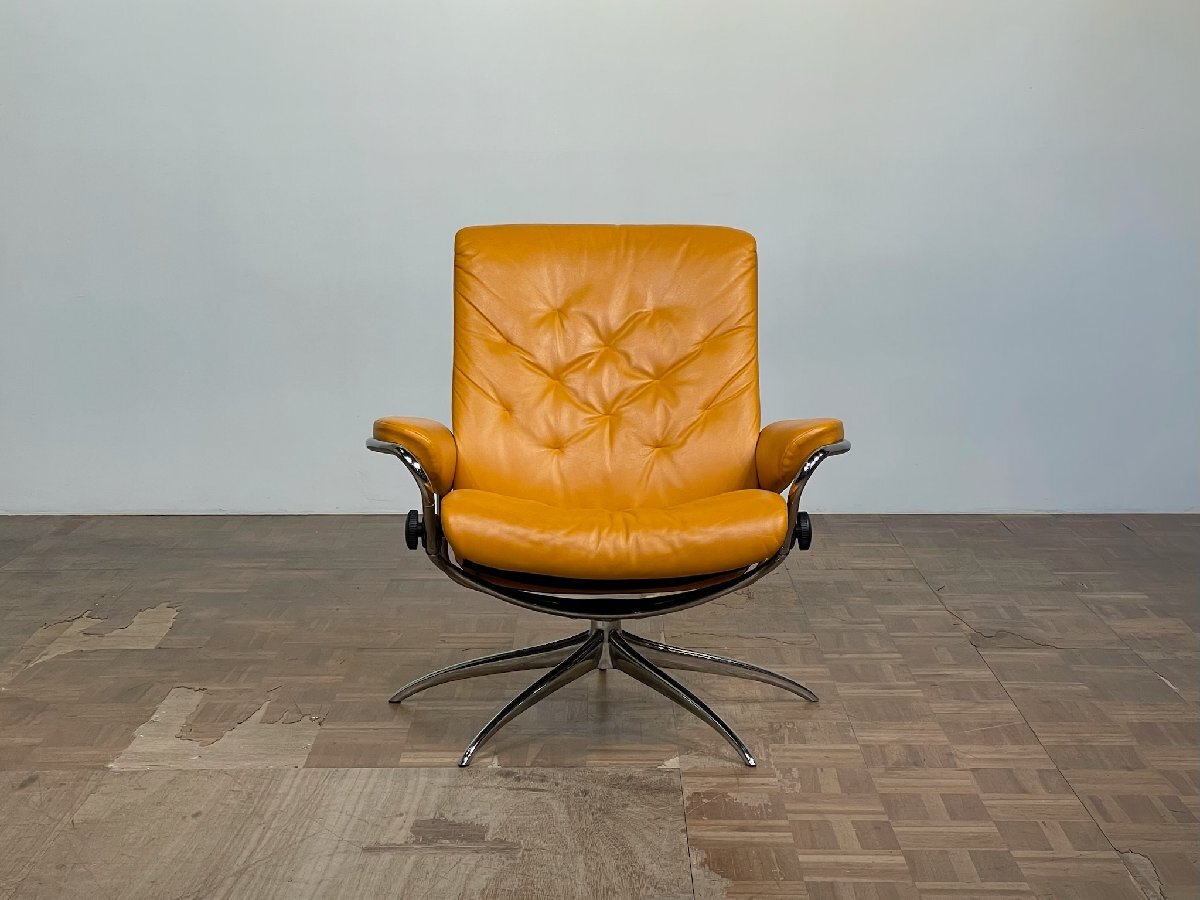 フレームと台座にクローム仕上げの光沢を配しジュエリーのような美しいチャームを持たせたデザインの美しいデザインリクライニングチェア。Ekornes / Stresslessより。